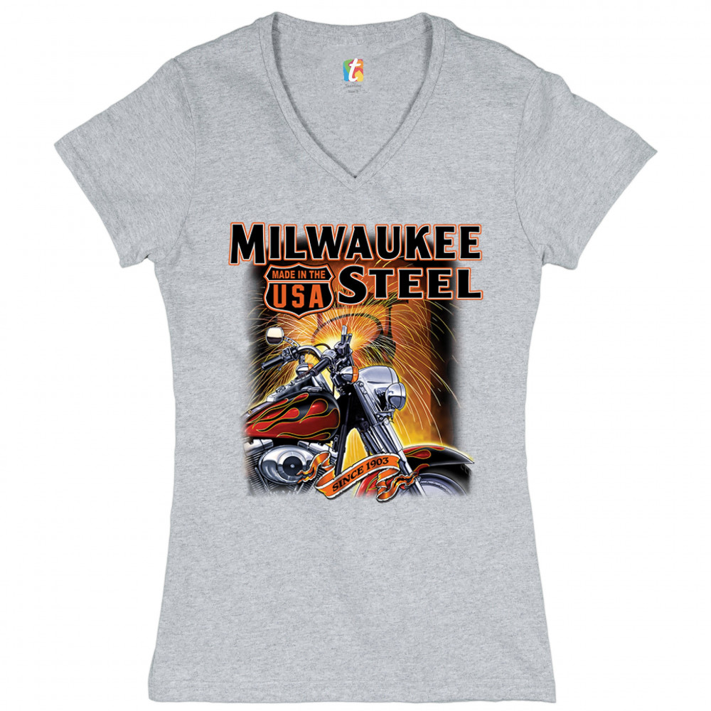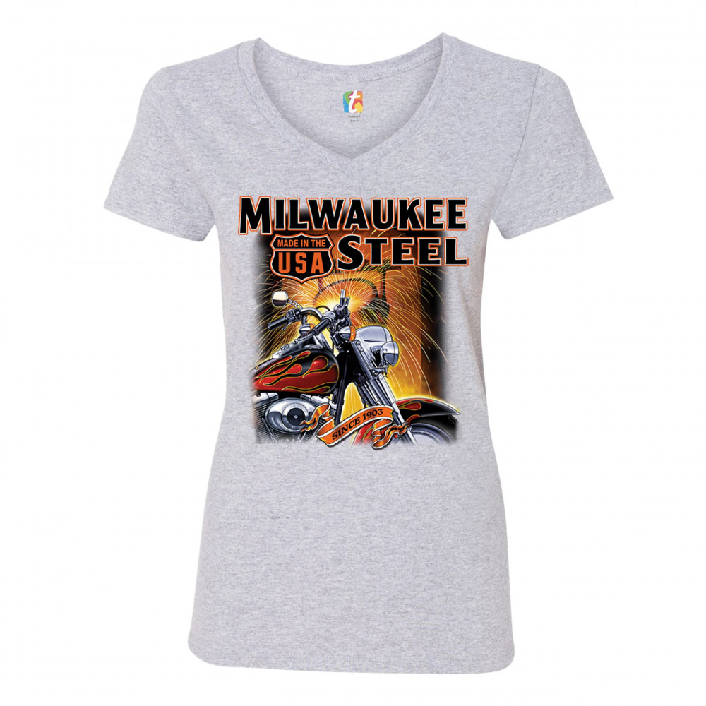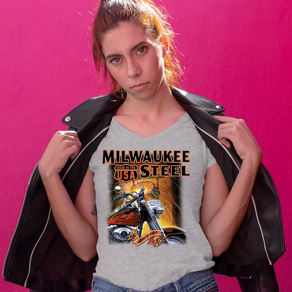 A print featuring a motorcycle in the front and a melting furnace in the background with sparkles flying all over the place. The print says: "Milwaukee Steel". There is also a sign that says "made in the USA" and a stripe with "since 1903" written on it.