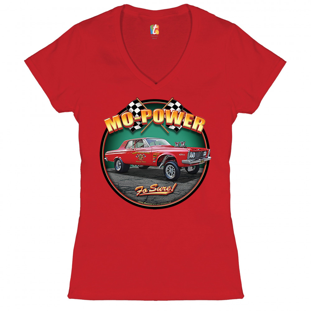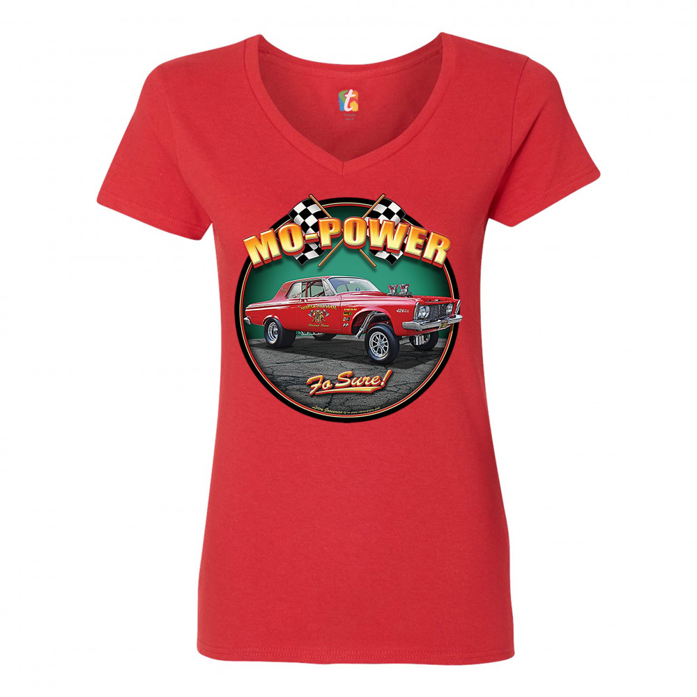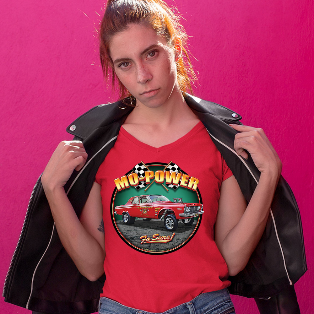 MO-POWER FO SURE! women's v-neck t-shirt american muscle car route 66 tee red