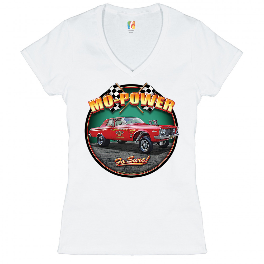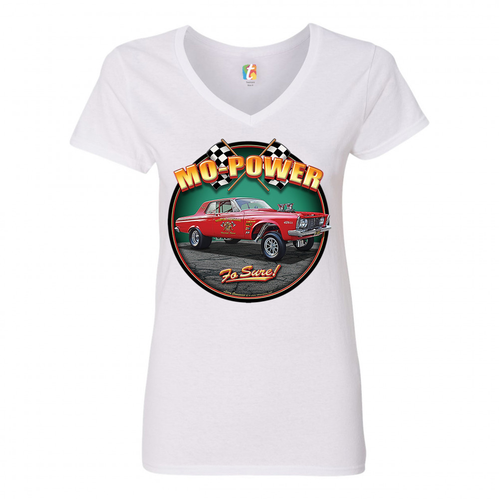 MO-POWER FO SURE! women's v-neck t-shirt american muscle car route 66 tee white