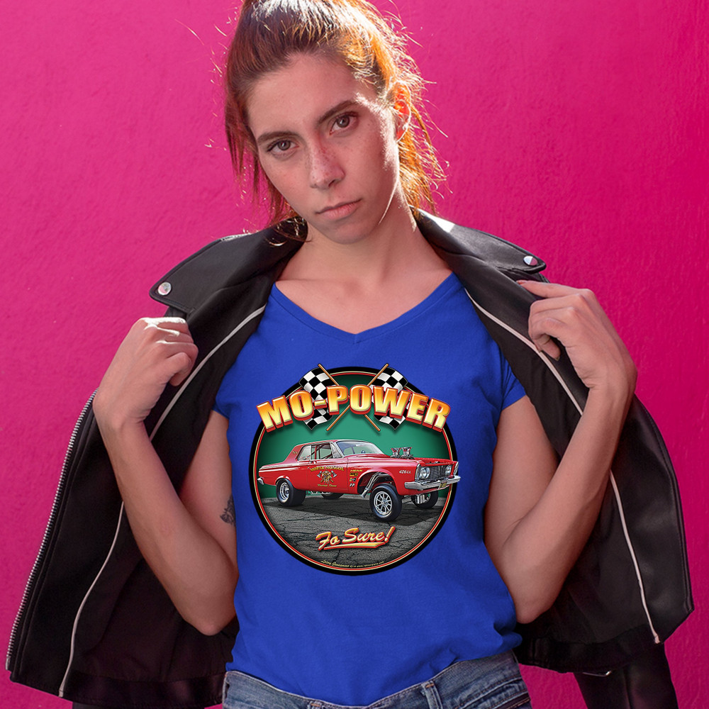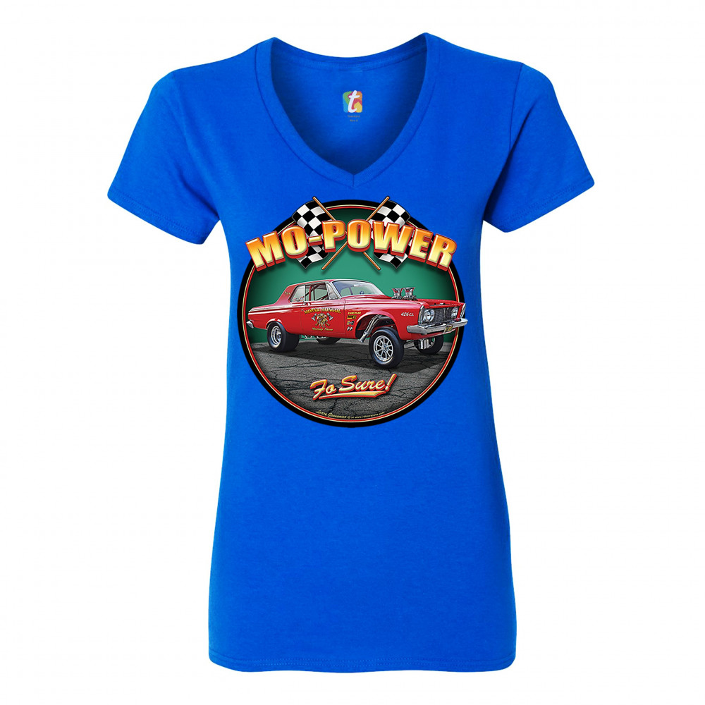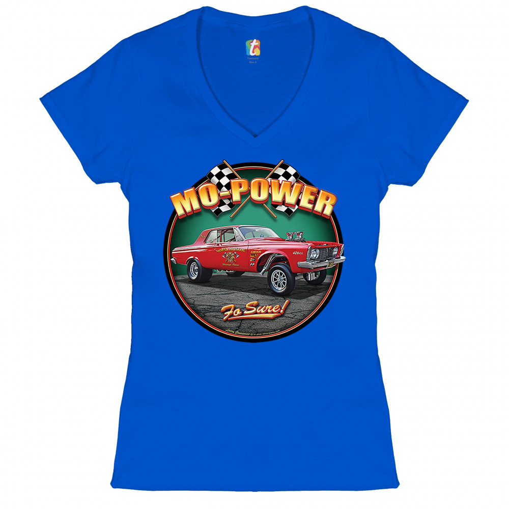 MO-POWER FO SURE! women's v-neck t-shirt american muscle car route 66 tee royal blue
