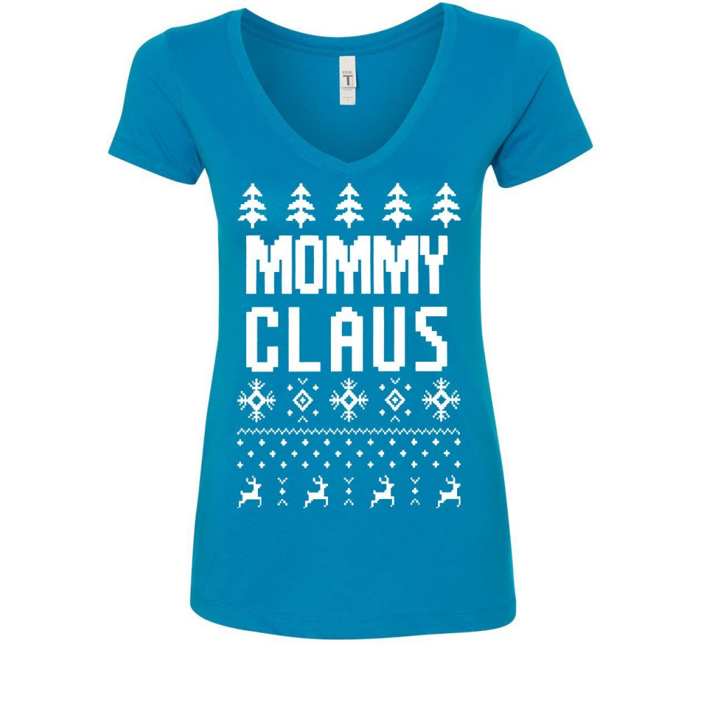 MOMMY CLAUS women's v-neck t-shirt funny ugly sweater santa christmas xmas turquoise