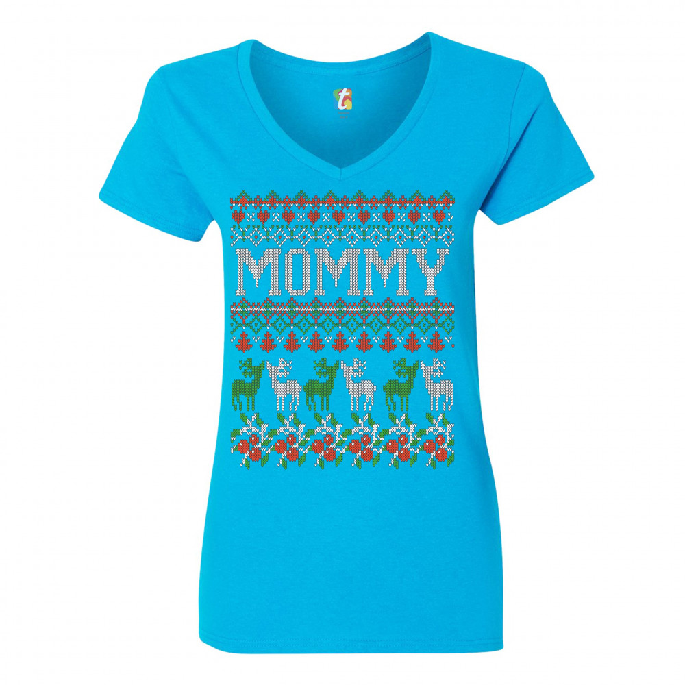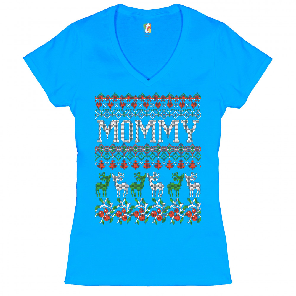 MOMMY women's v-neck t-shirt ugly sweatshirt for mom christmas reindeer tee turquoise