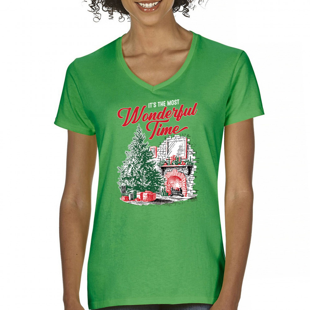 Most Wonderful Time Christmas shirt – cozy holiday design with fireplace scene, Christmas tree, Santa Claus, Rudolph, and festive living room charm.