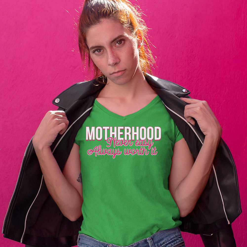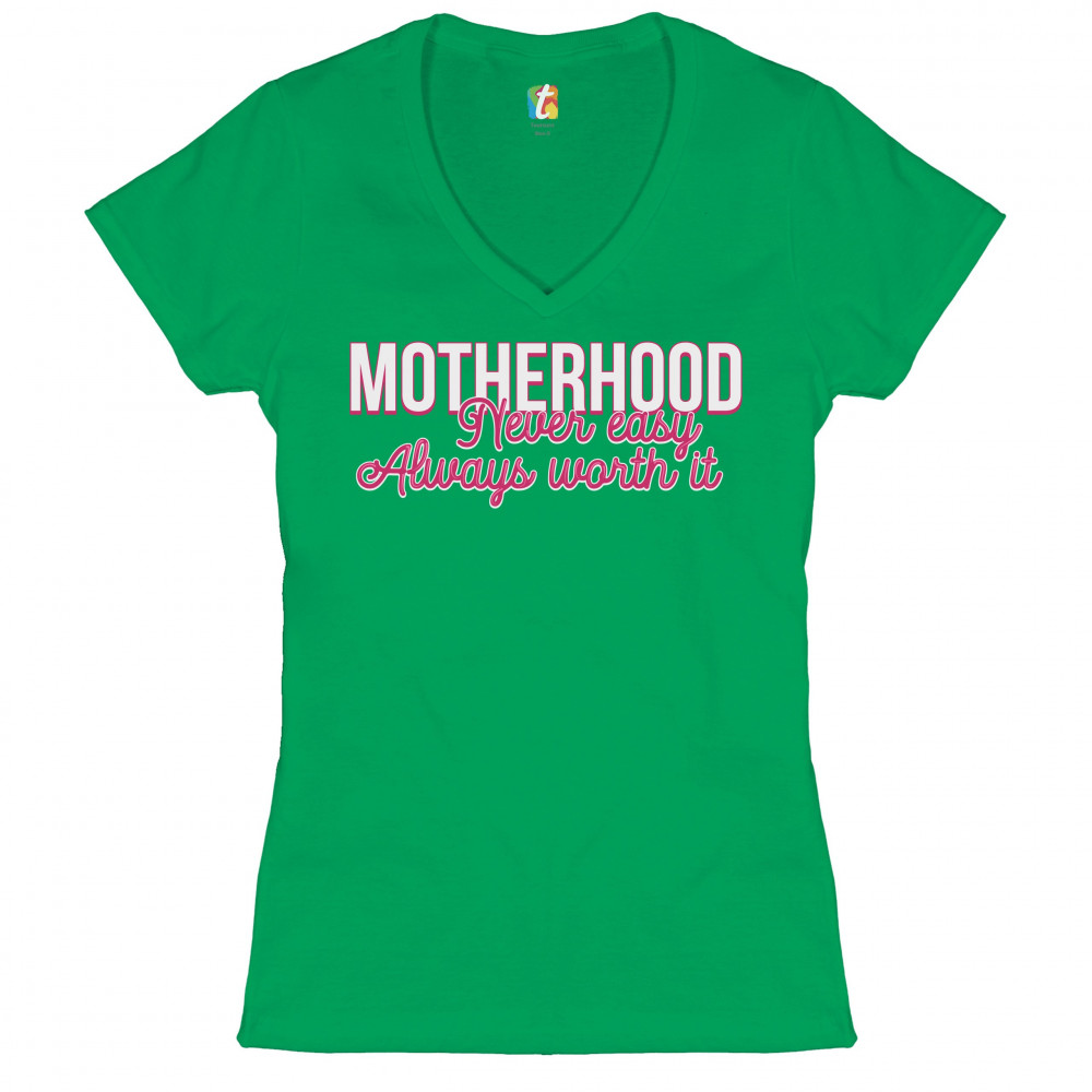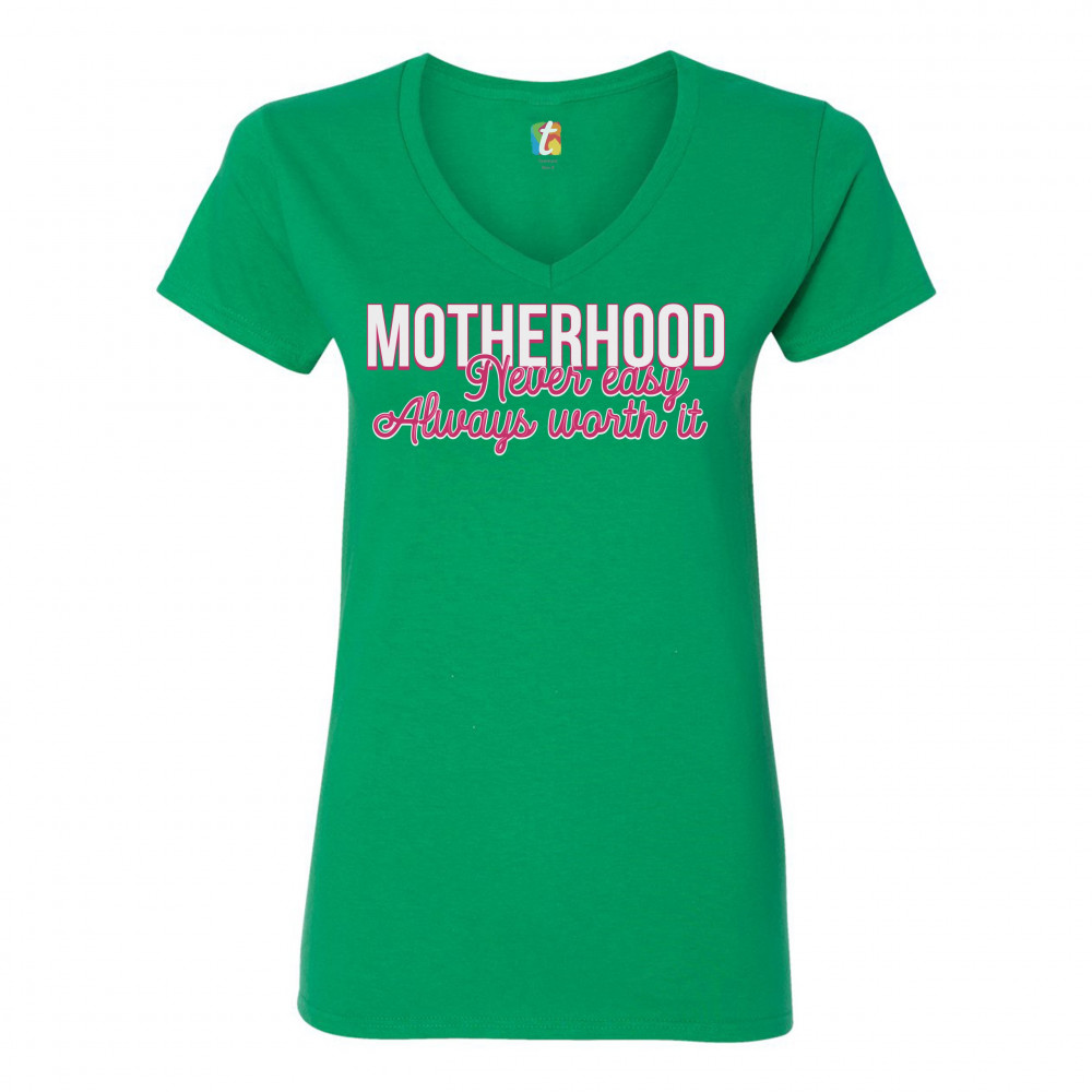 MOTHERHOOD NEVER EASY ALWAYS WORTH IT women's v-neck t-shirt mother's day tee green
