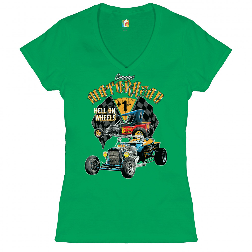 MOTORHEAD HOT ROD women's v-neck t-shirt hell on wheels route 66 racing tee green