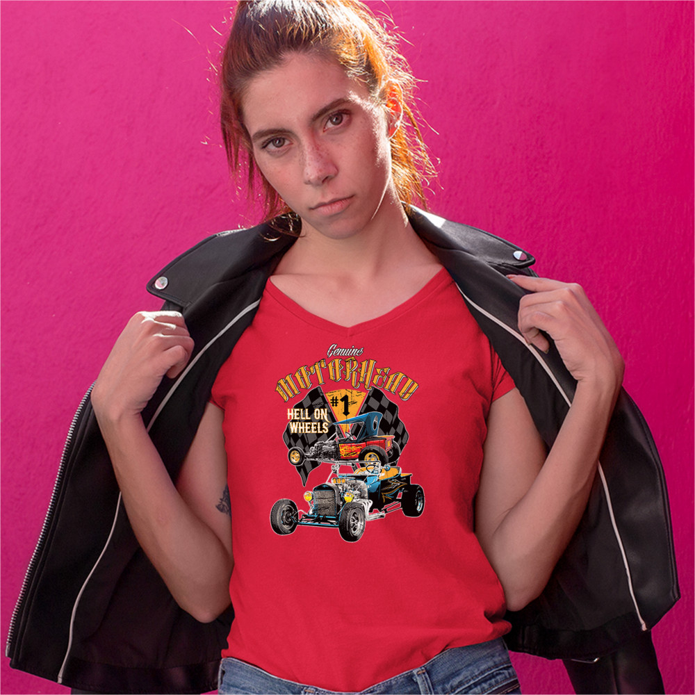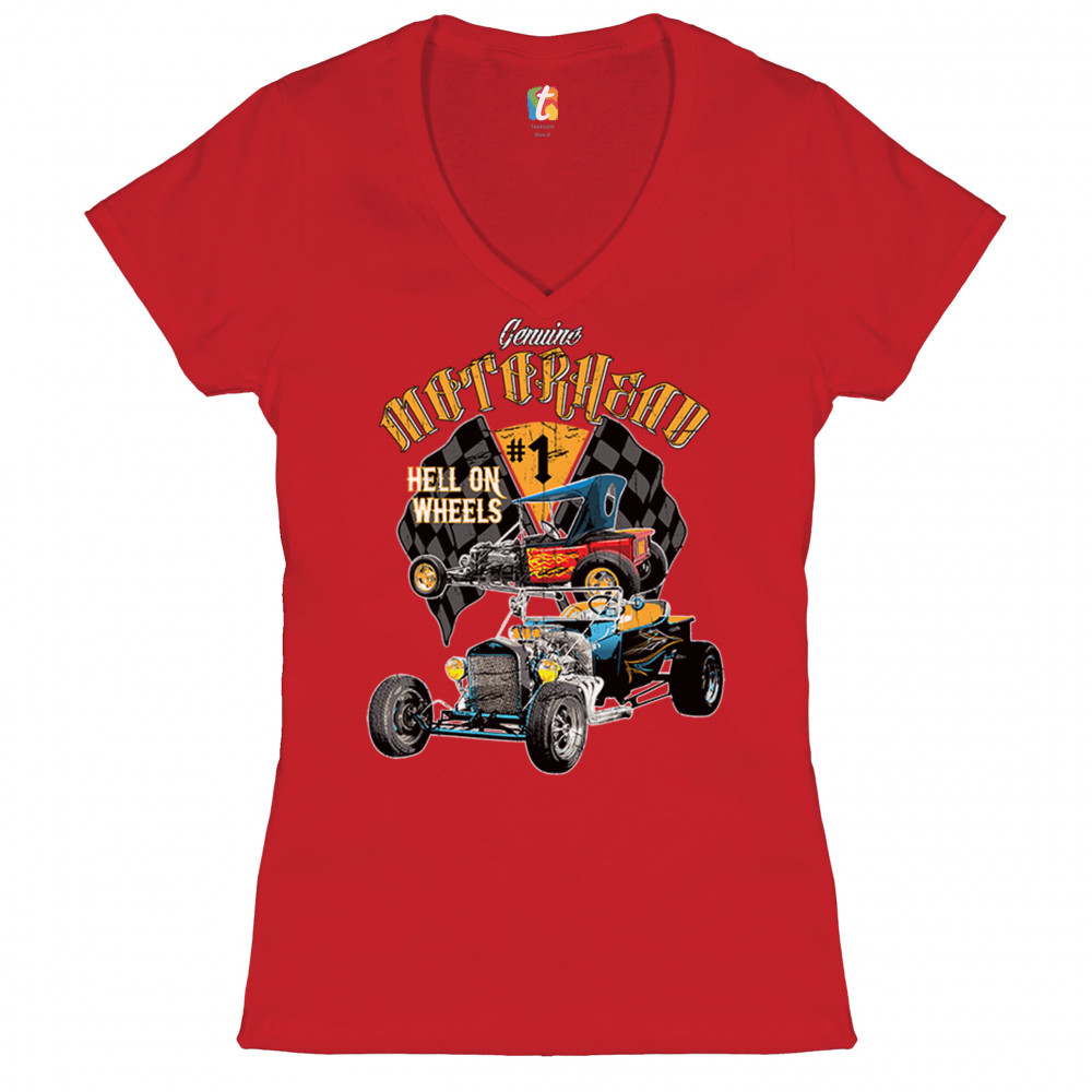 MOTORHEAD HOT ROD women's v-neck t-shirt hell on wheels route 66 racing tee red