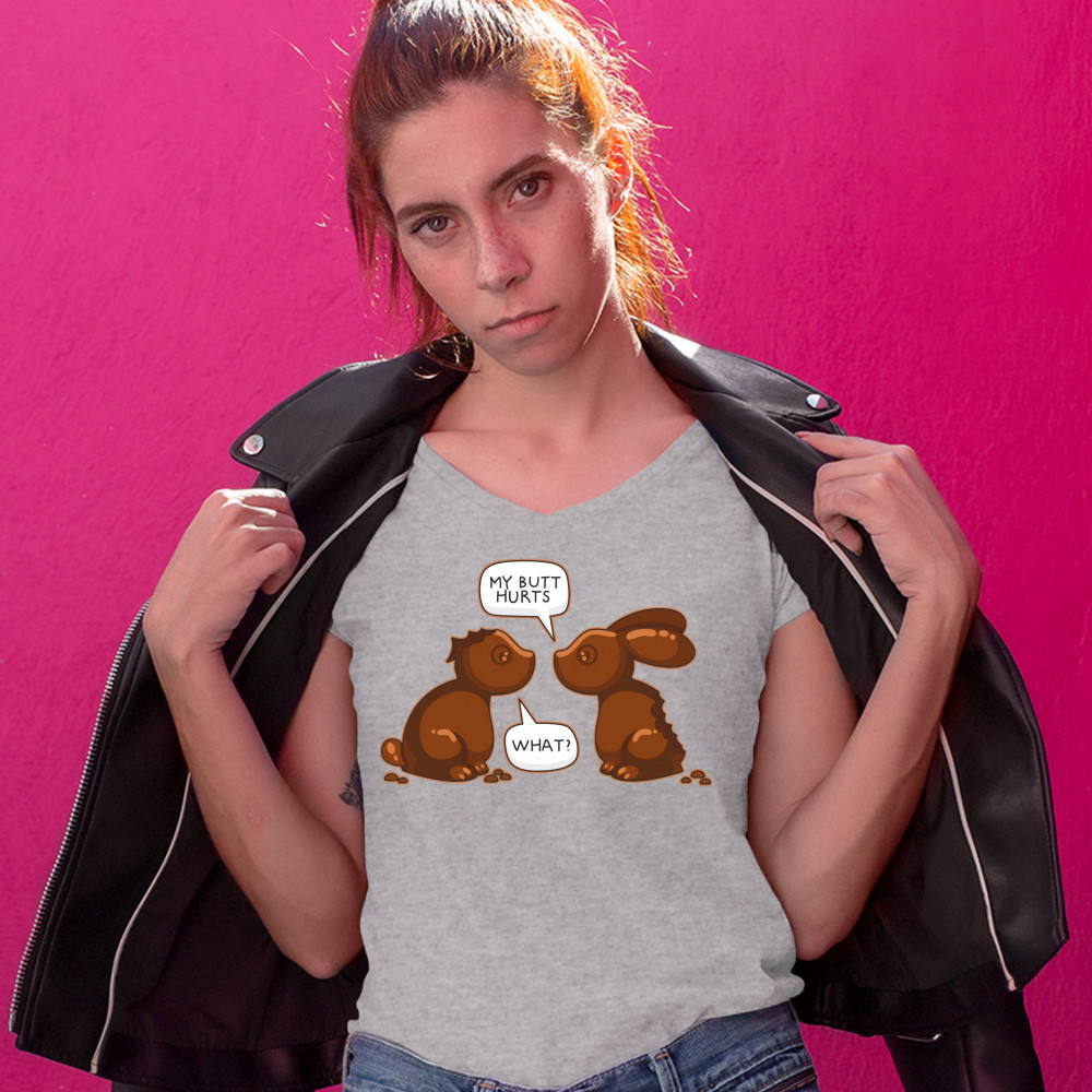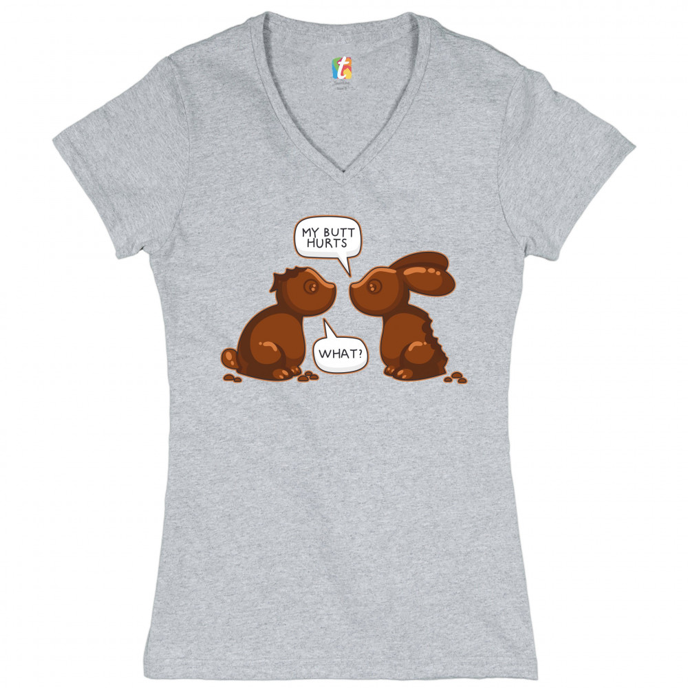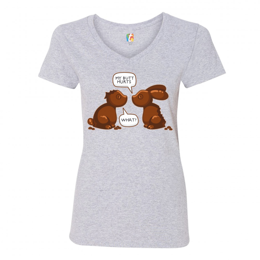 MY BUTT HURTS - WHAT? women's v-neck t-shirt chocolate bunnies easter tee gray