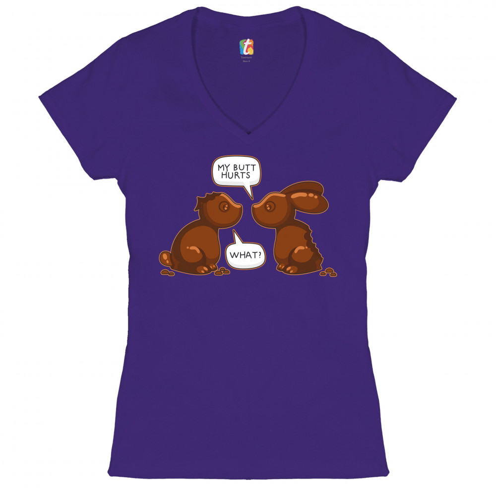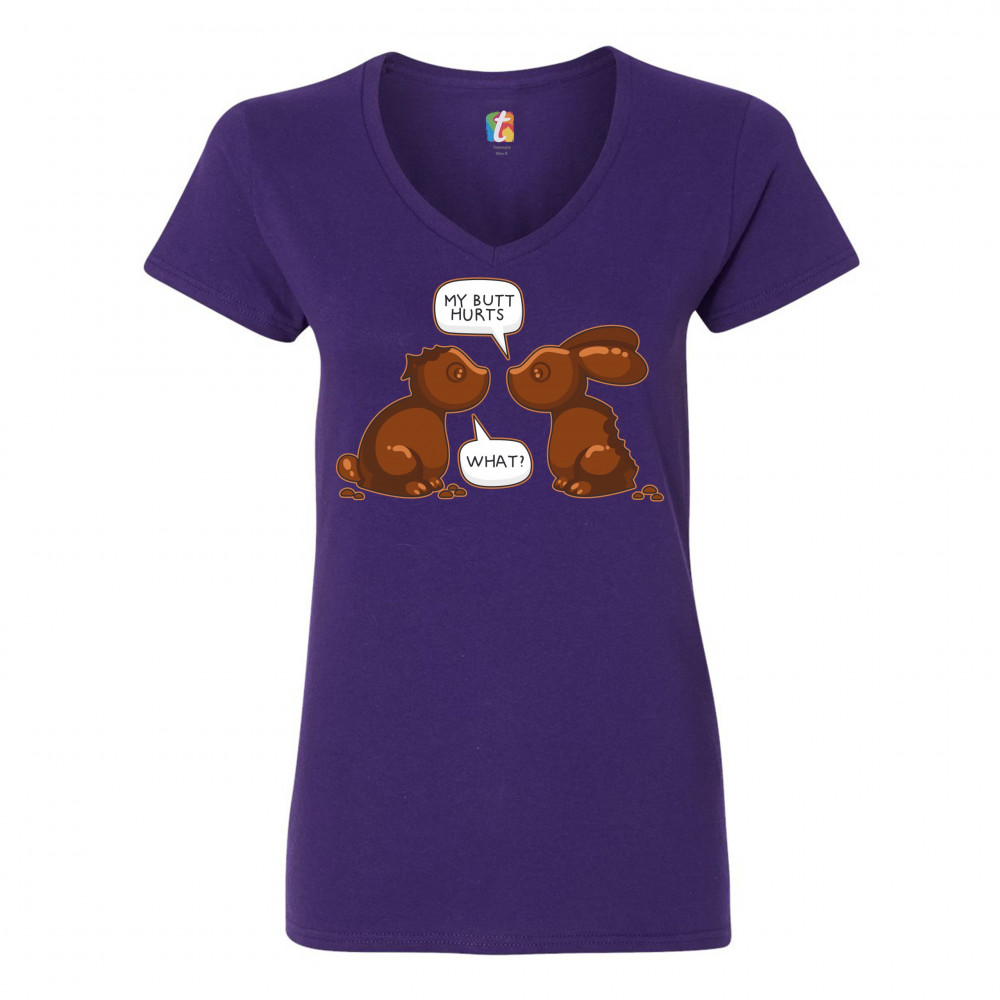 MY BUTT HURTS - WHAT? women's v-neck t-shirt chocolate bunnies easter tee purple