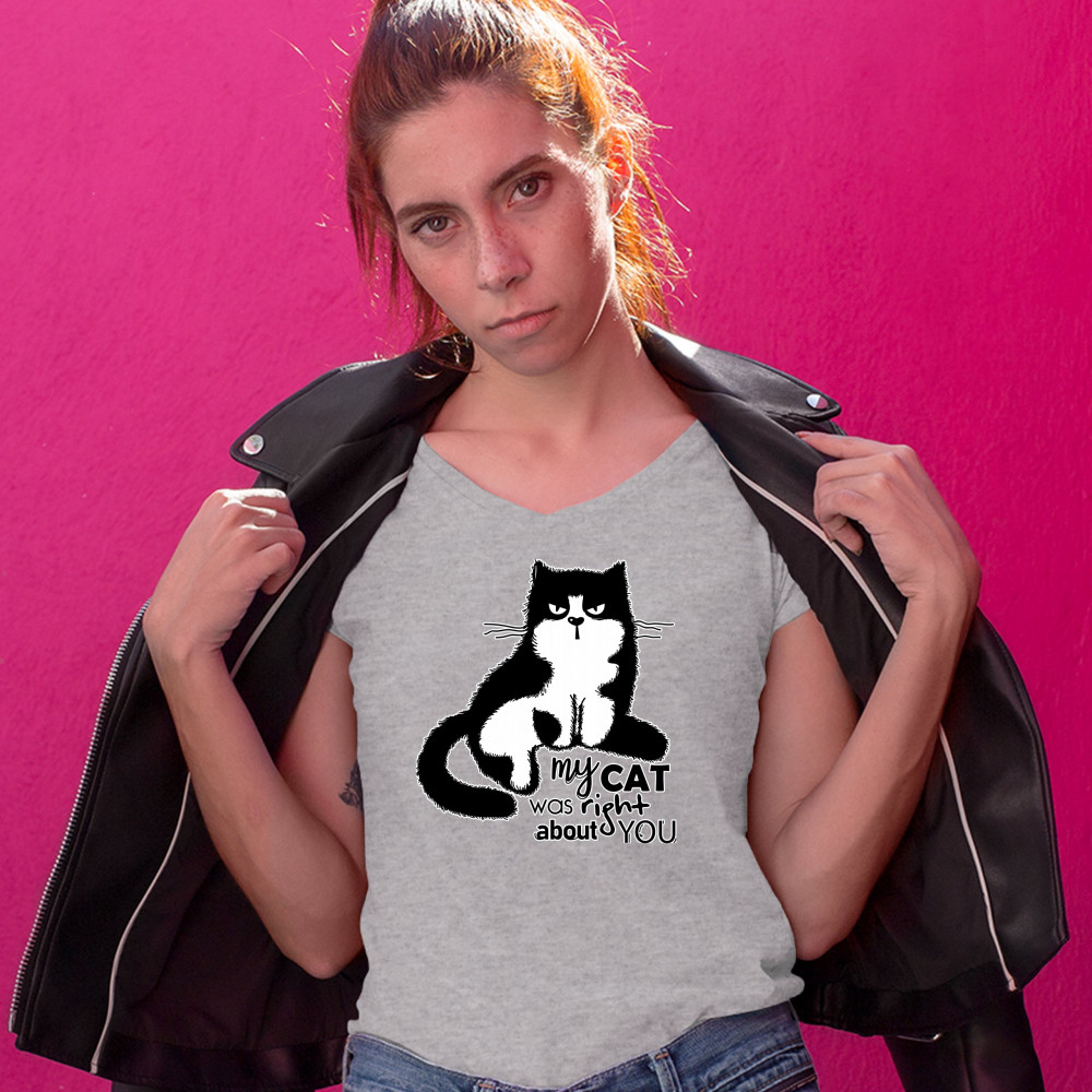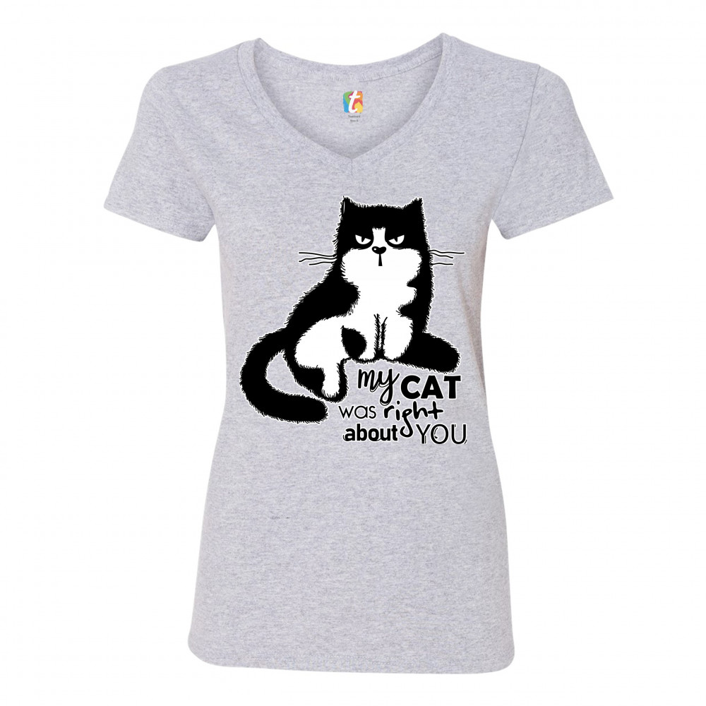MY CAT WAS RIGHT ABOUT YOU women's v-neck t-shirt cat lover funny kitty tee gray