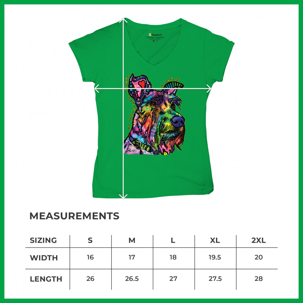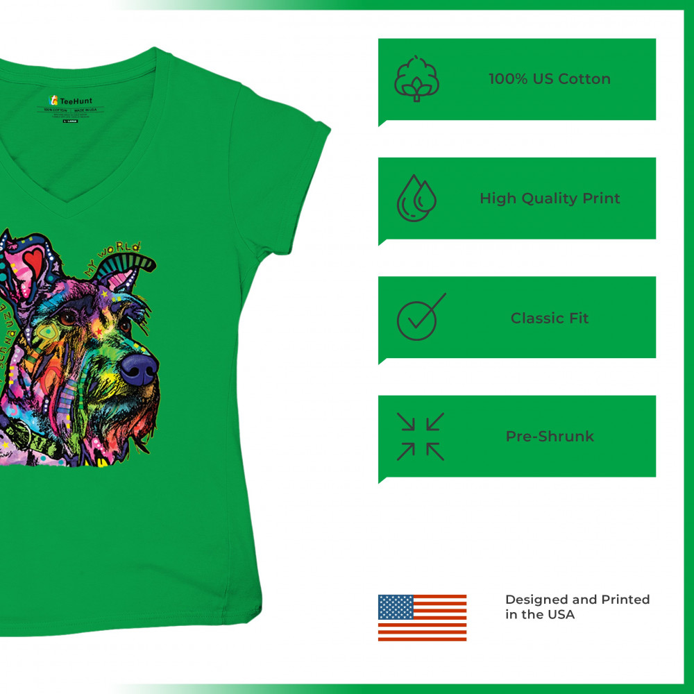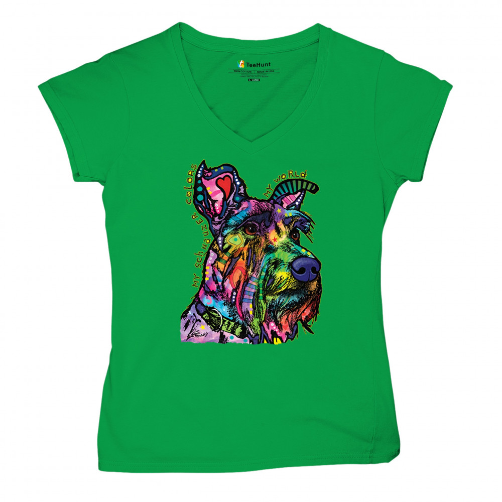 MY SCHNAUZER COLORS MY WORLD women's v-neck t-shirt dean russo pet dog mom tee green