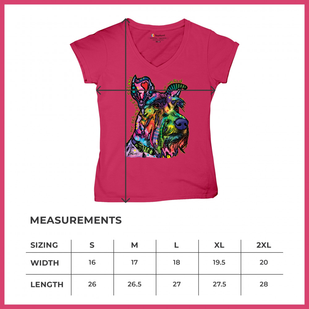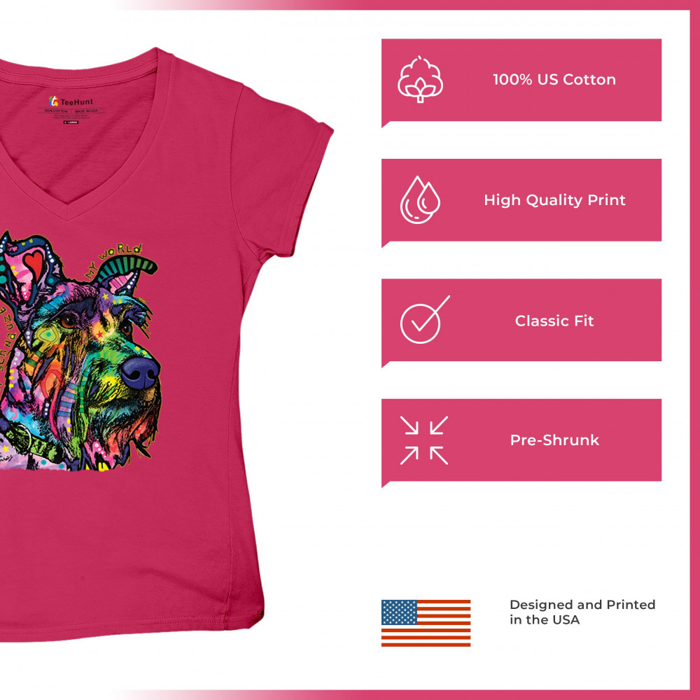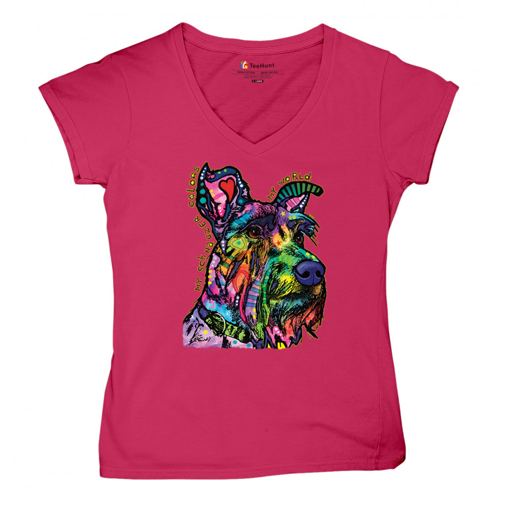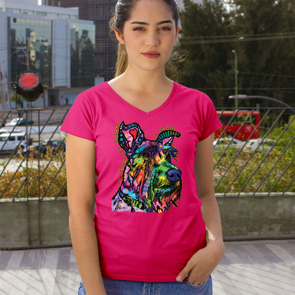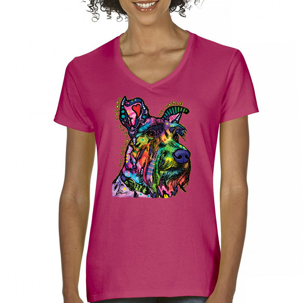 MY SCHNAUZER COLORS MY WORLD women's v-neck t-shirt dean russo pet dog mom tee pink