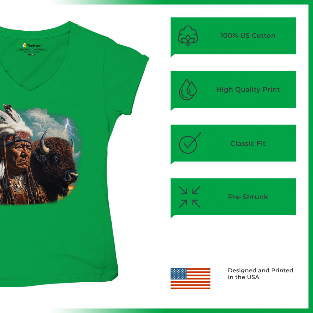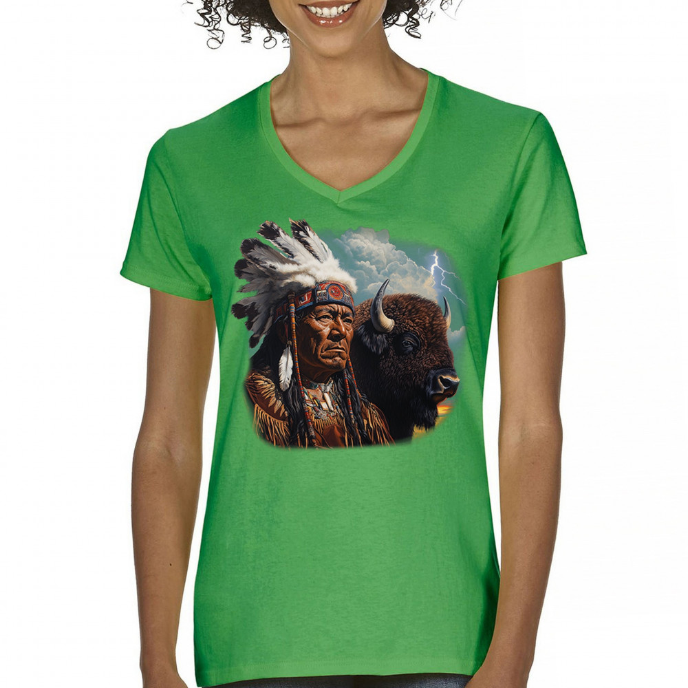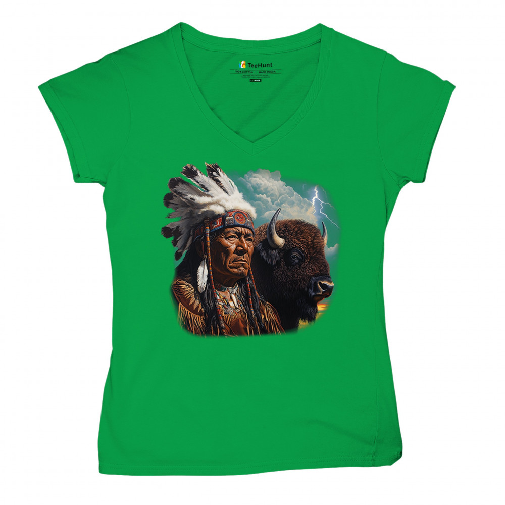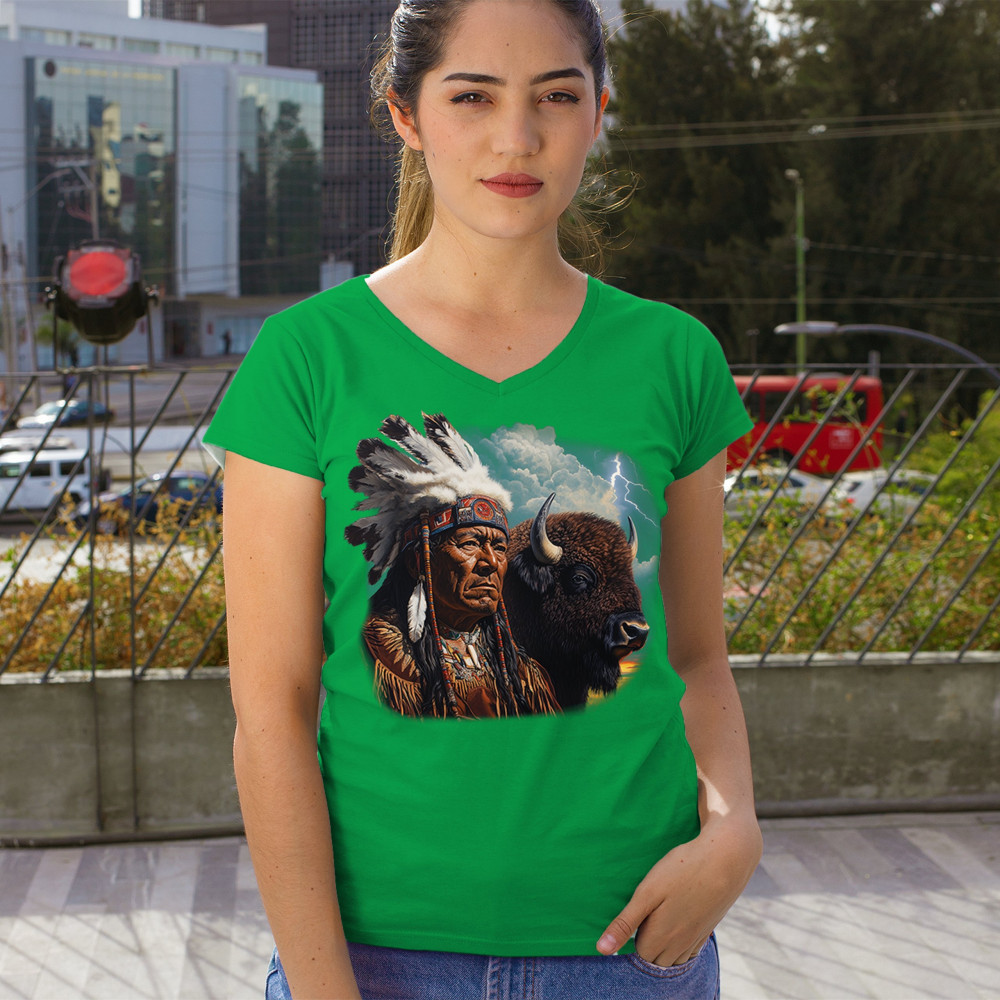 Bold tribal elder and bison design framed by lightning sky—honoring heritage, strength, resilience, and sacred connection to nature.
