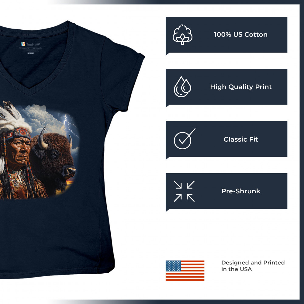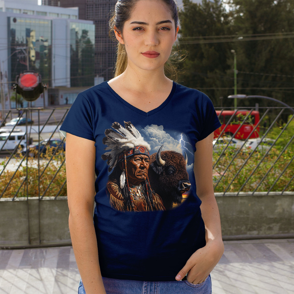 Bold tribal elder and bison design framed by lightning sky—honoring heritage, strength, resilience, and sacred connection to nature.