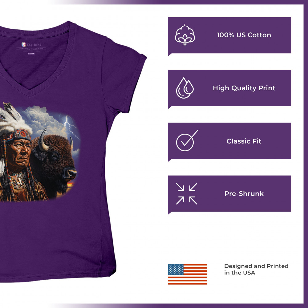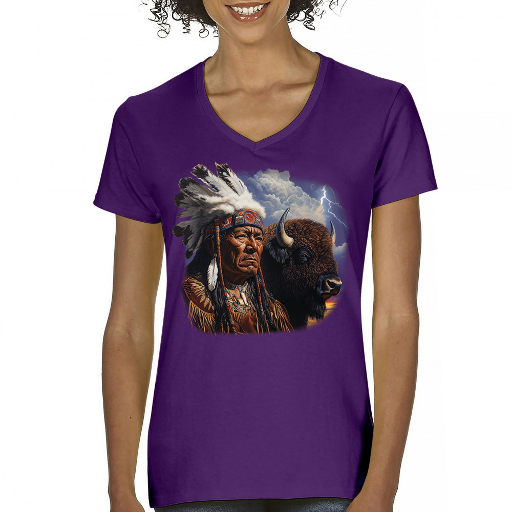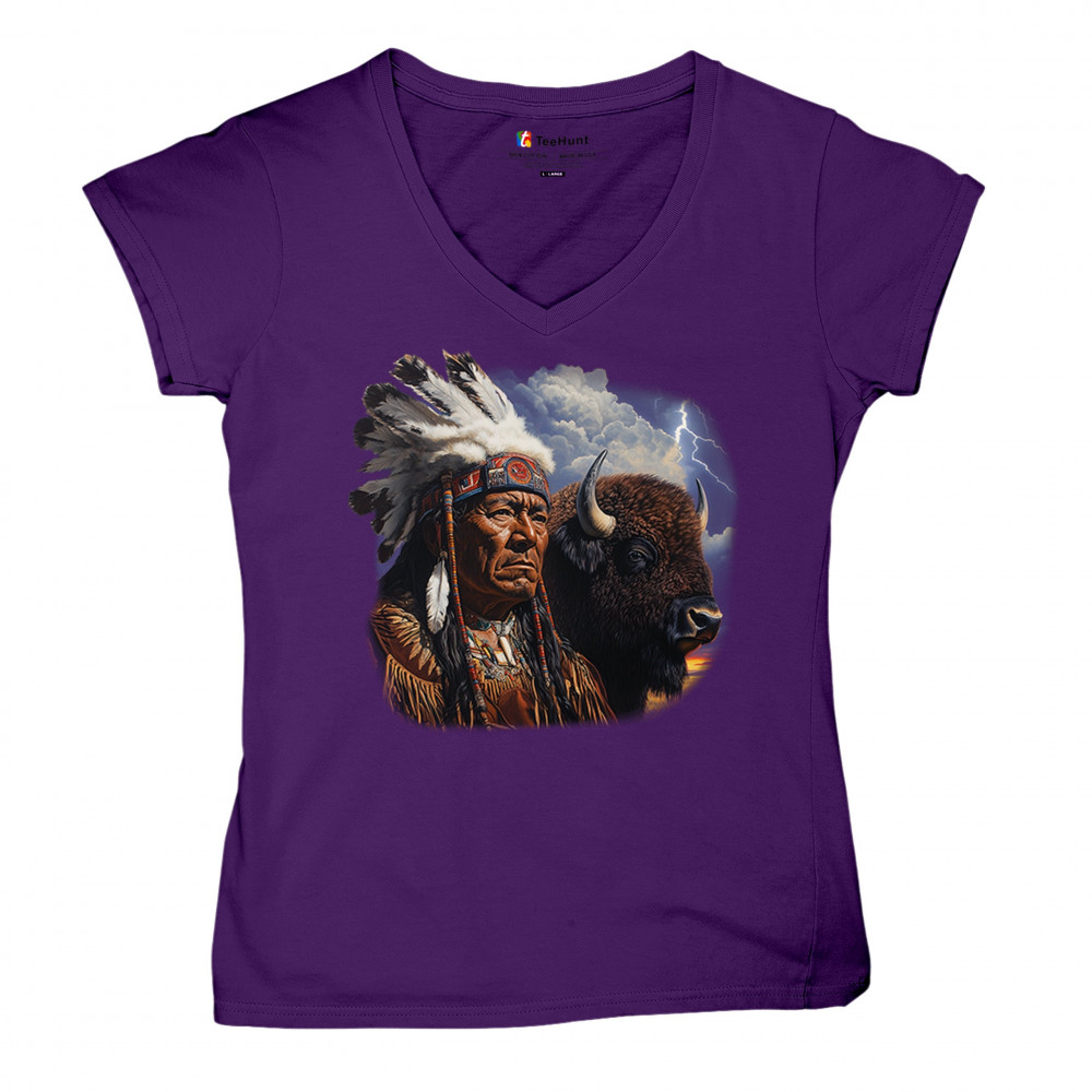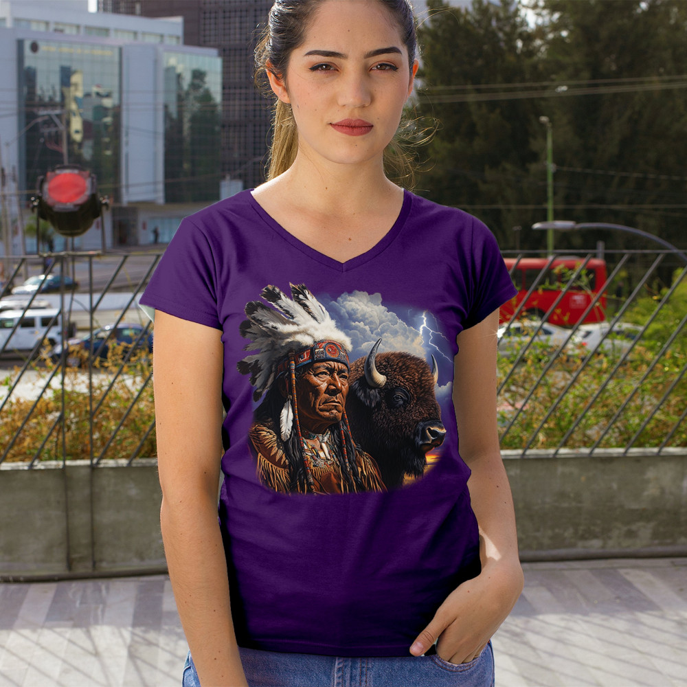 Bold tribal elder and bison design framed by lightning sky—honoring heritage, strength, resilience, and sacred connection to nature.