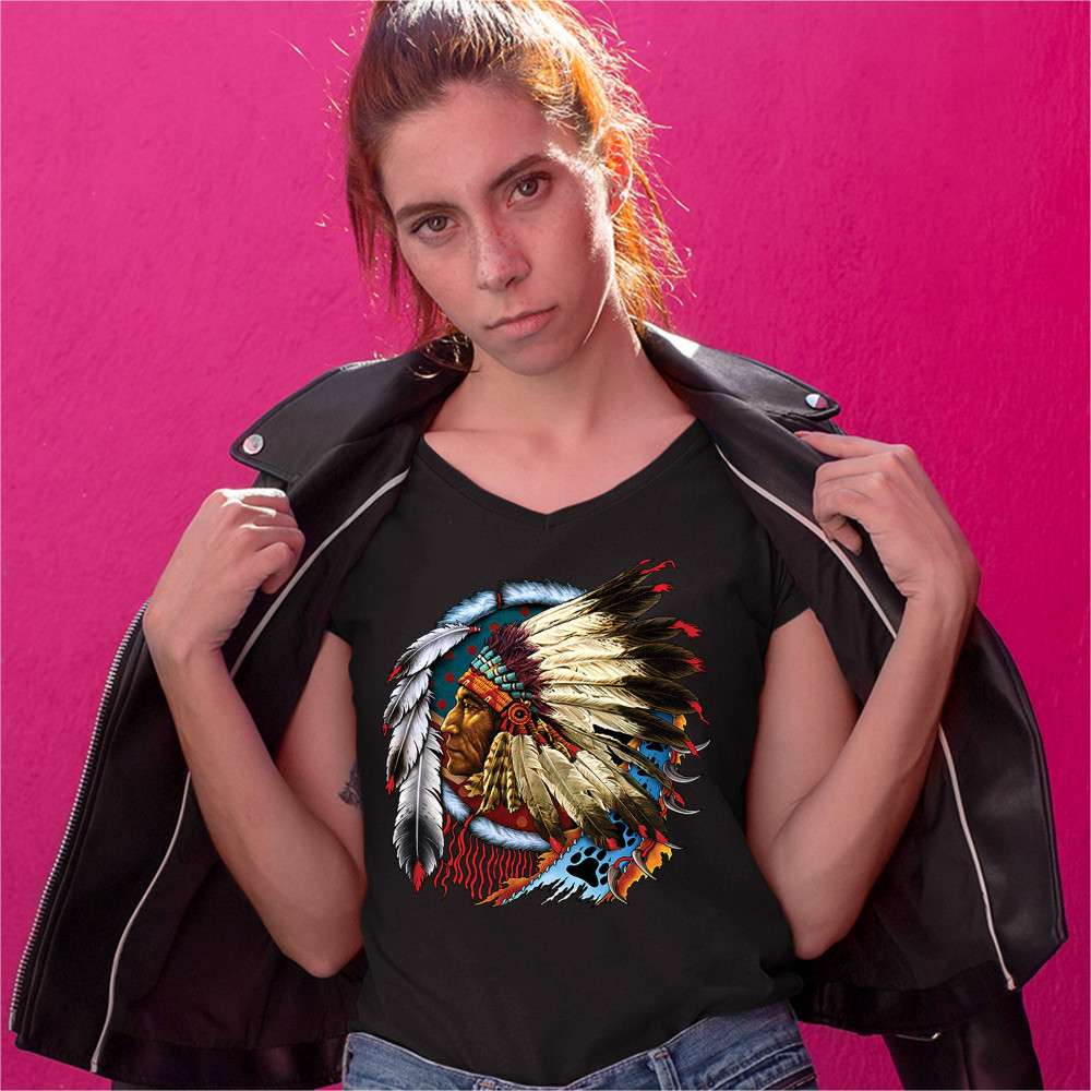 NATIVE AMERICAN CHIEF women's v-neck t-shirt war bonnet dreamcatcher tee black