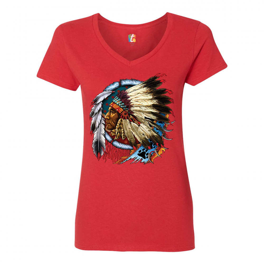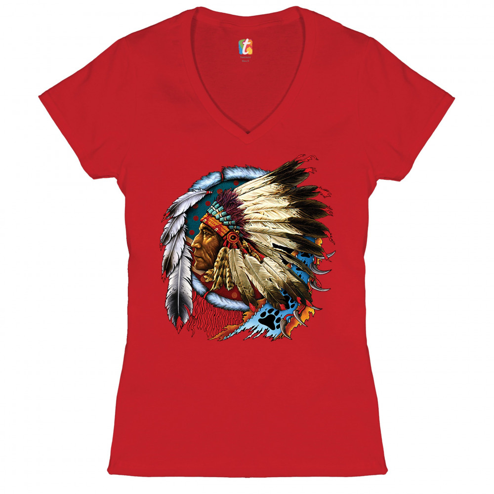 NATIVE AMERICAN CHIEF women's v-neck t-shirt war bonnet dreamcatcher tee red