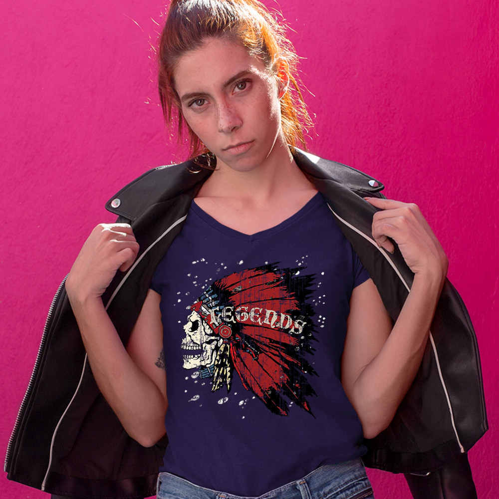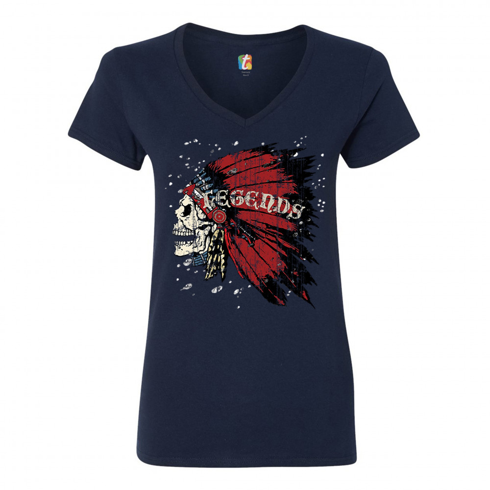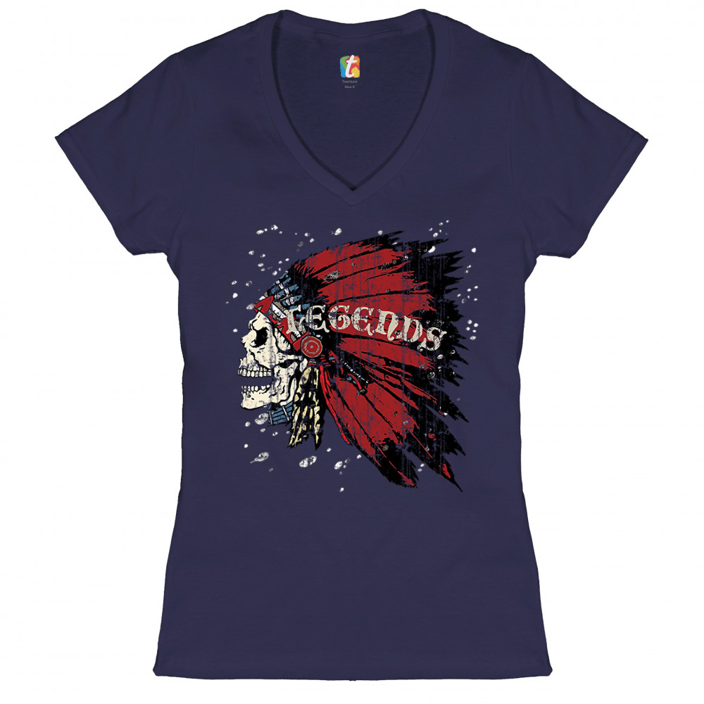 NATIVE AMERICAN LEGENDS women's v-neck t-shirt skull war bonnet headdress tee navy blue