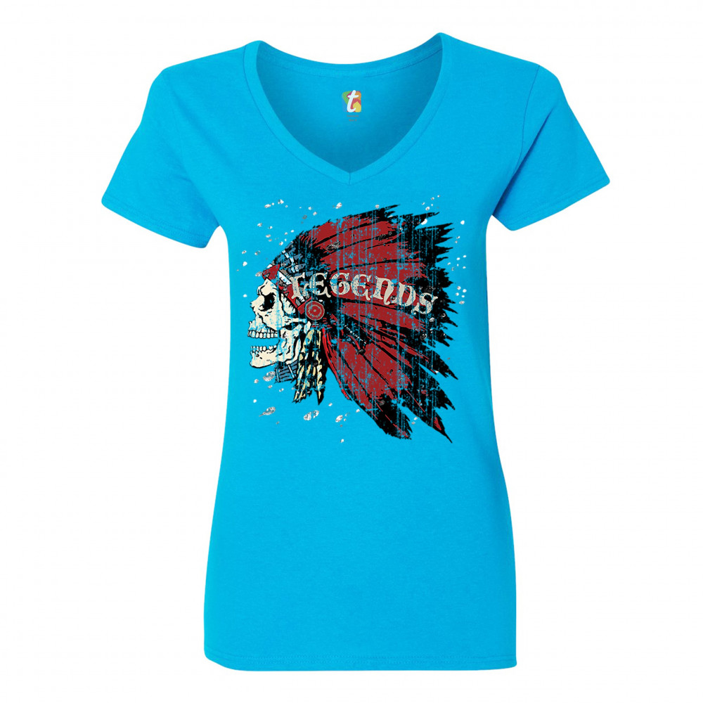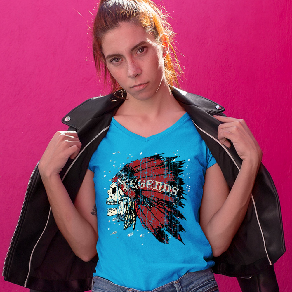 NATIVE AMERICAN LEGENDS women's v-neck t-shirt skull war bonnet headdress tee turquoise