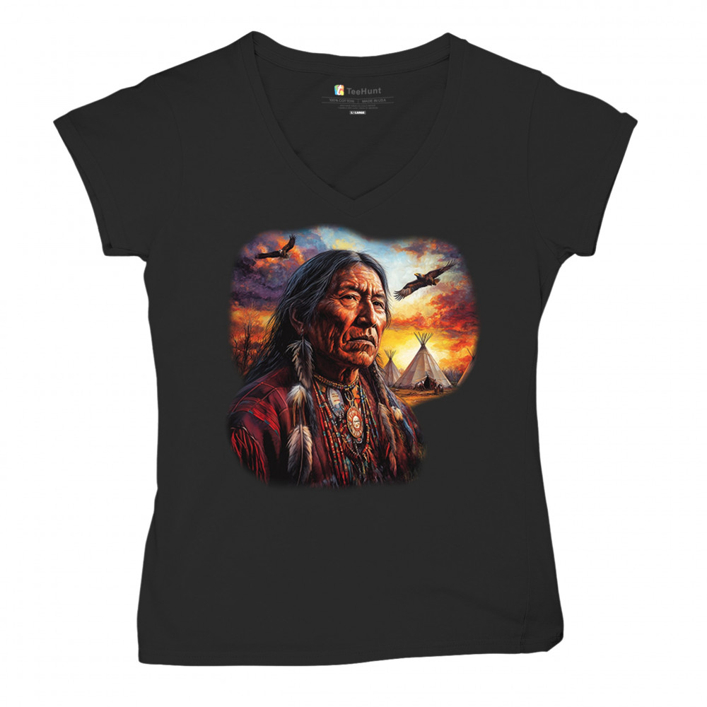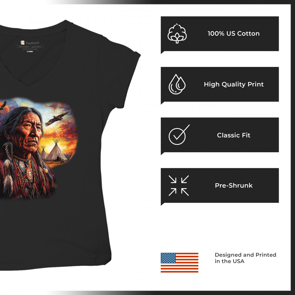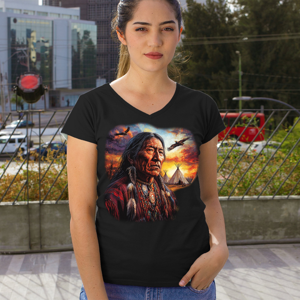 This vivid artwork features a Native American elder in traditional feathered attire, set before a blazing sunset with soaring eagles and peaceful teepees. The scene symbolizes strength, heritage, and spiritual wisdom. A heartfelt tribute to tribal pride, ancestral legacy, and cultural connection to land.