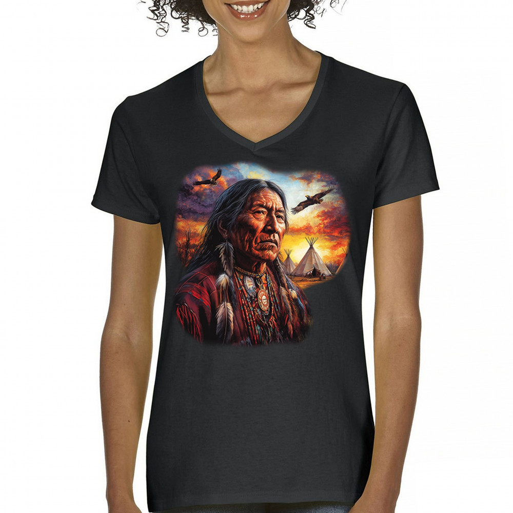Native elder, teepees, sunset, and eagles come together in this spiritual design celebrating indigenous culture, heritage, and nature’s beauty.