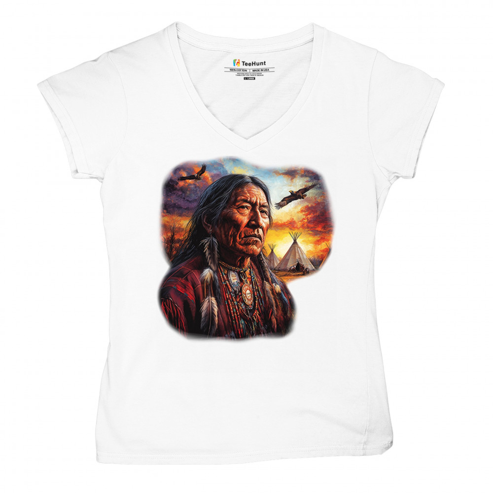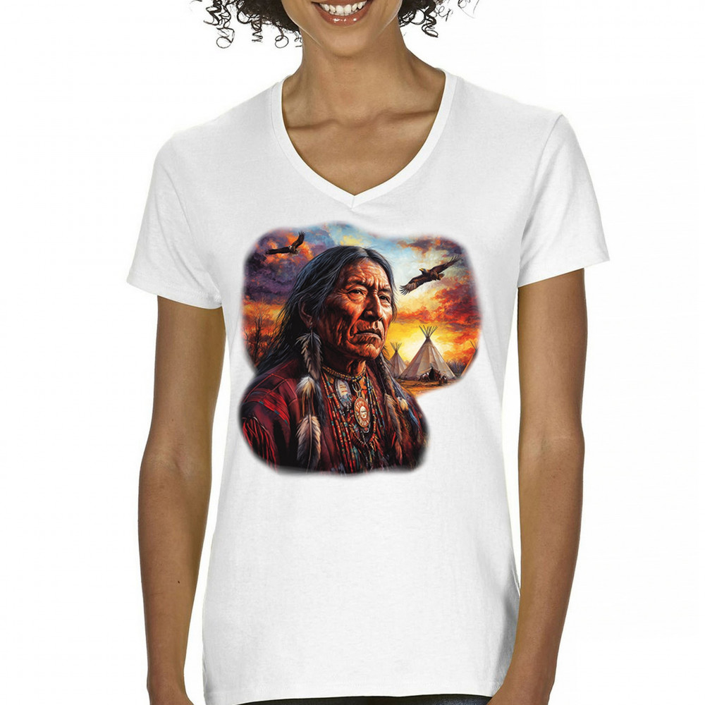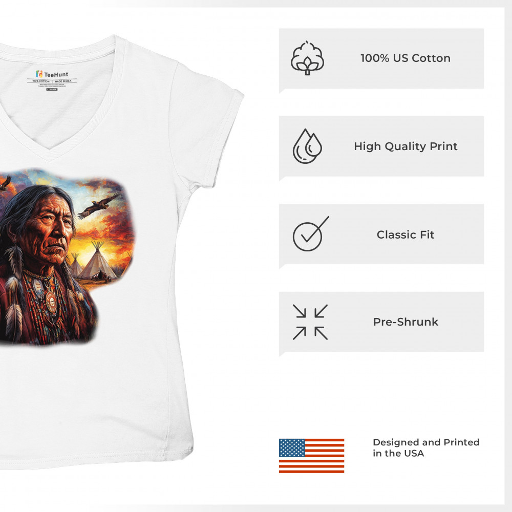 Native elder, teepees, sunset, and eagles come together in this spiritual design celebrating indigenous culture, heritage, and nature’s beauty.
