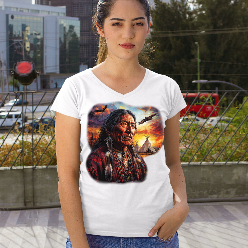 This vivid artwork features a Native American elder in traditional feathered attire, set before a blazing sunset with soaring eagles and peaceful teepees. The scene symbolizes strength, heritage, and spiritual wisdom. A heartfelt tribute to tribal pride, ancestral legacy, and cultural connection to land.