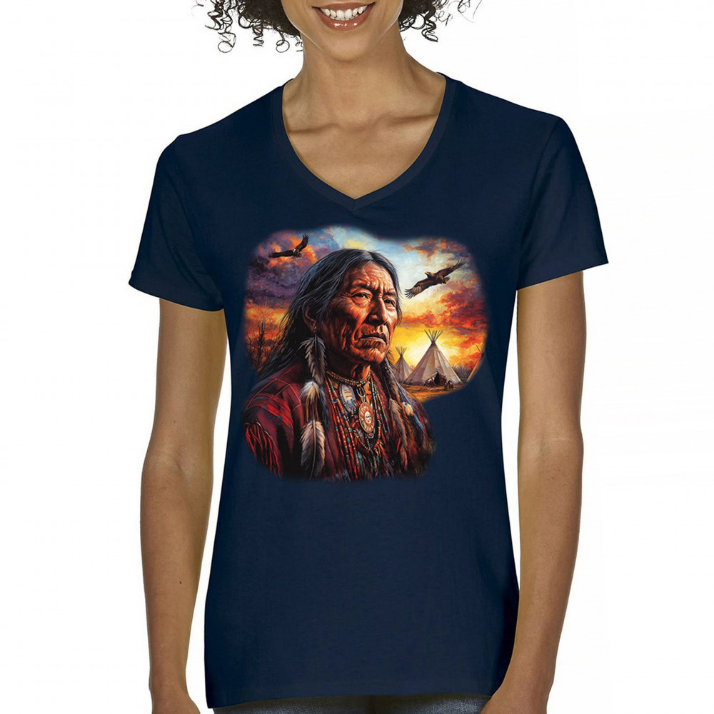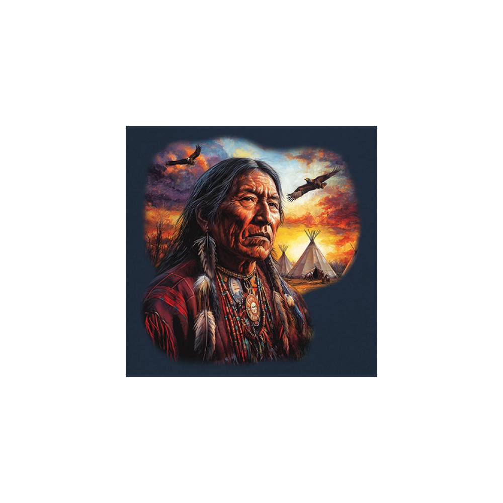 Native elder, teepees, sunset, and eagles come together in this spiritual design celebrating indigenous culture, heritage, and nature’s beauty.