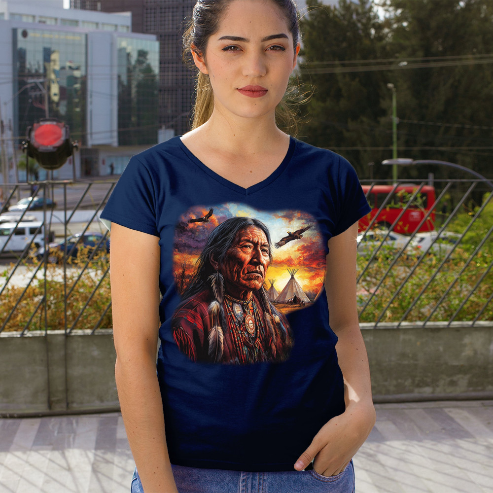 This vivid artwork features a Native American elder in traditional feathered attire, set before a blazing sunset with soaring eagles and peaceful teepees. The scene symbolizes strength, heritage, and spiritual wisdom. A heartfelt tribute to tribal pride, ancestral legacy, and cultural connection to land.