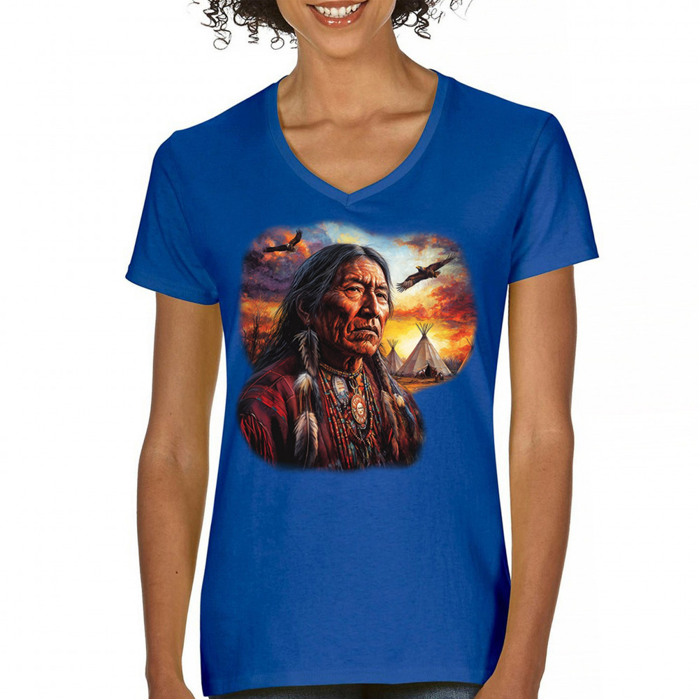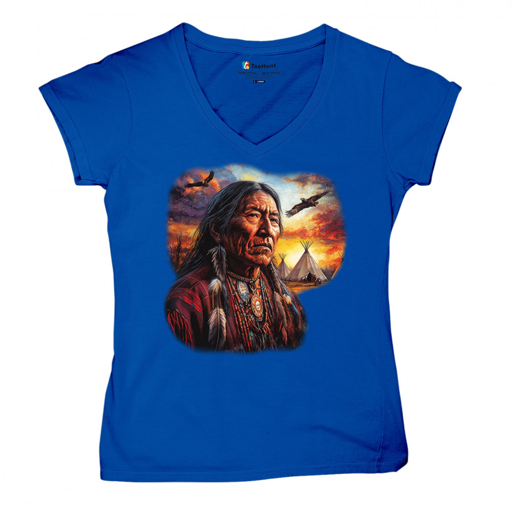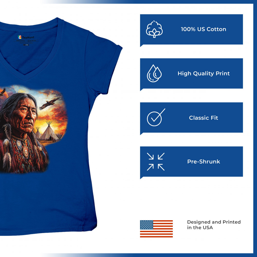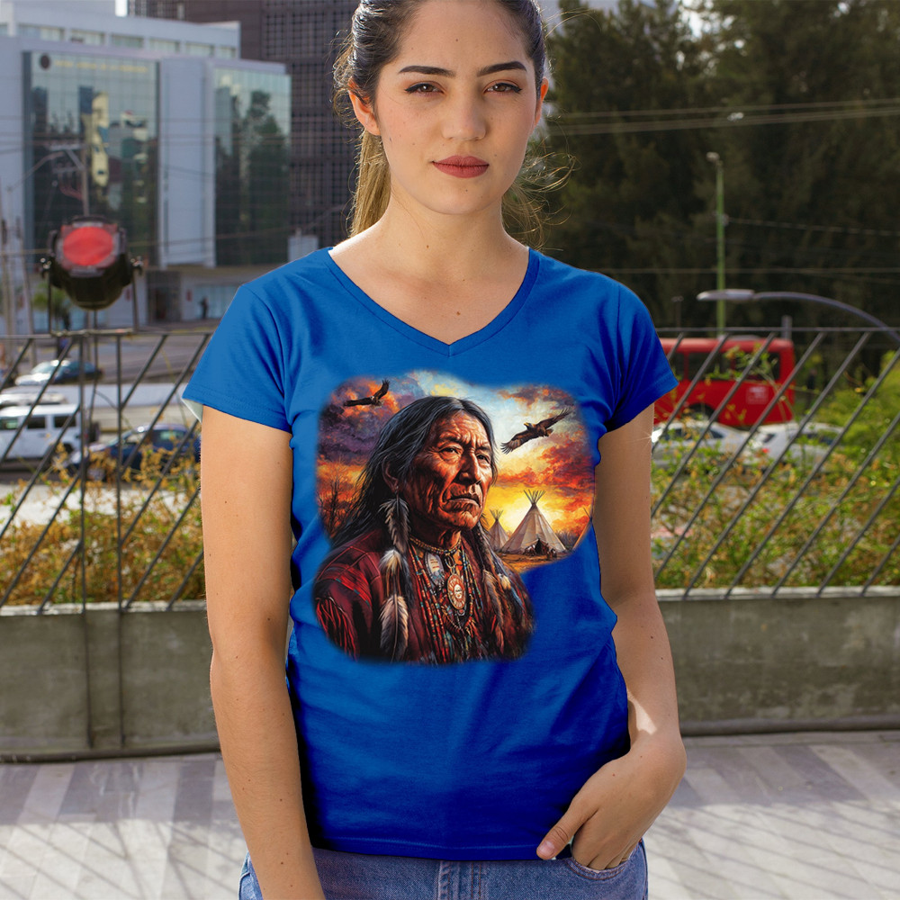 This vivid artwork features a Native American elder in traditional feathered attire, set before a blazing sunset with soaring eagles and peaceful teepees. The scene symbolizes strength, heritage, and spiritual wisdom. A heartfelt tribute to tribal pride, ancestral legacy, and cultural connection to land.