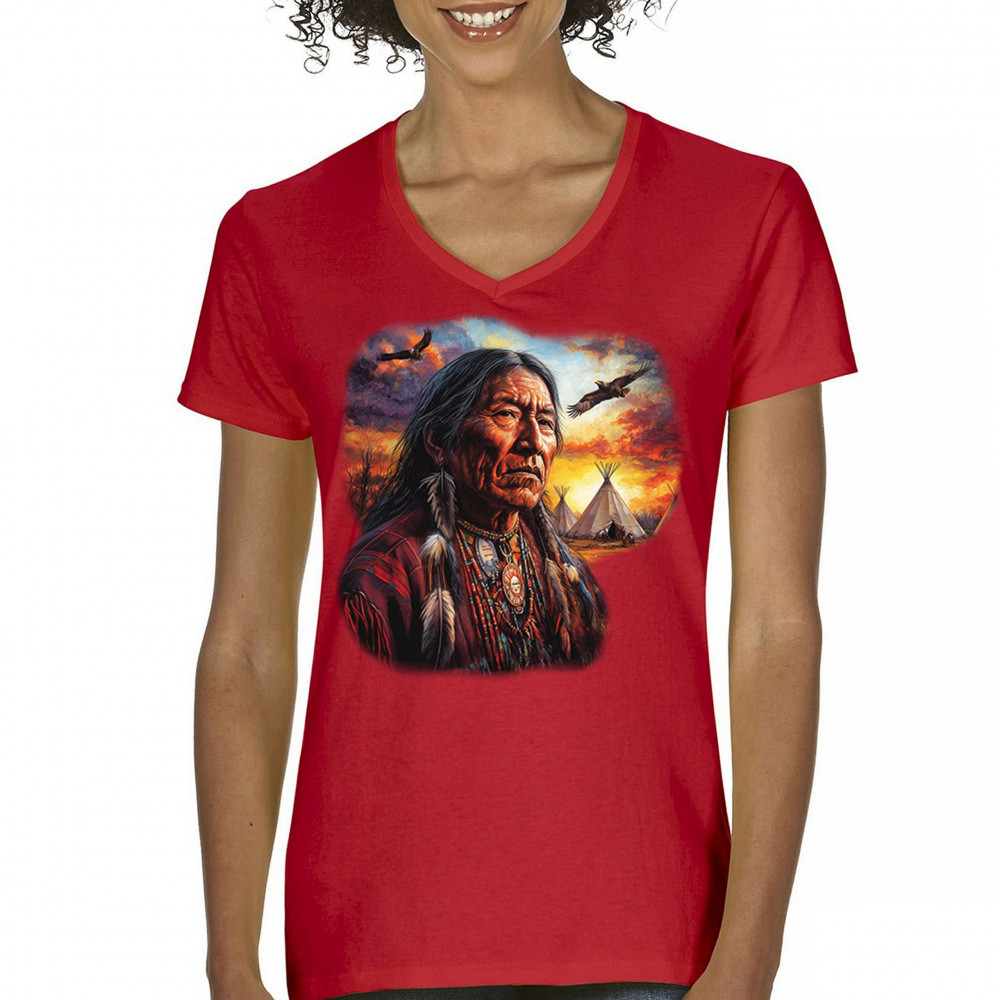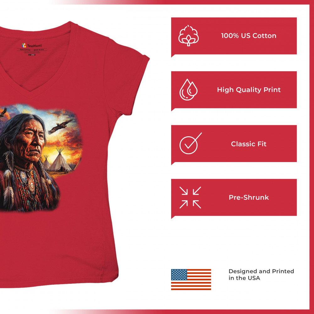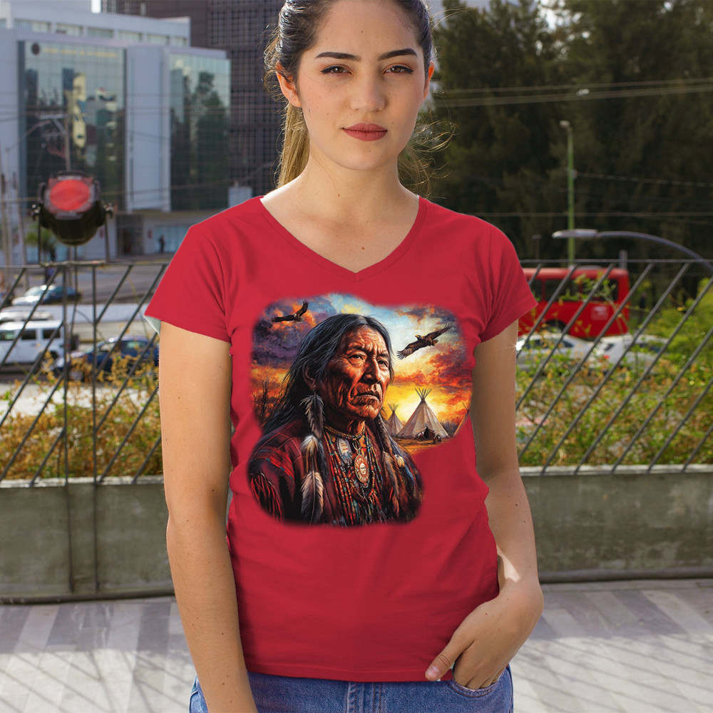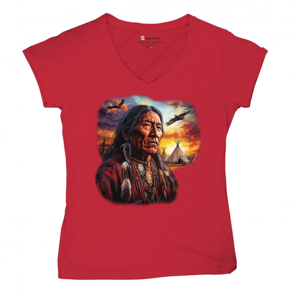This vivid artwork features a Native American elder in traditional feathered attire, set before a blazing sunset with soaring eagles and peaceful teepees. The scene symbolizes strength, heritage, and spiritual wisdom. A heartfelt tribute to tribal pride, ancestral legacy, and cultural connection to land.