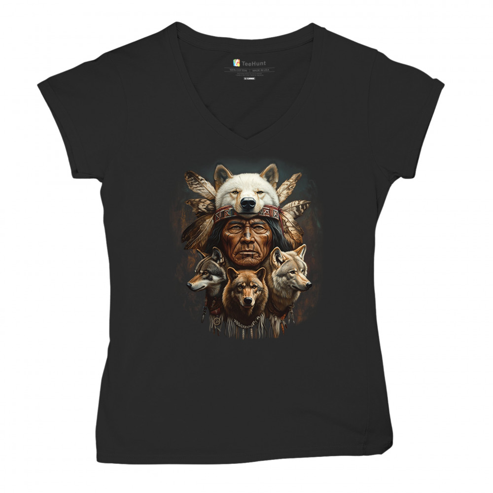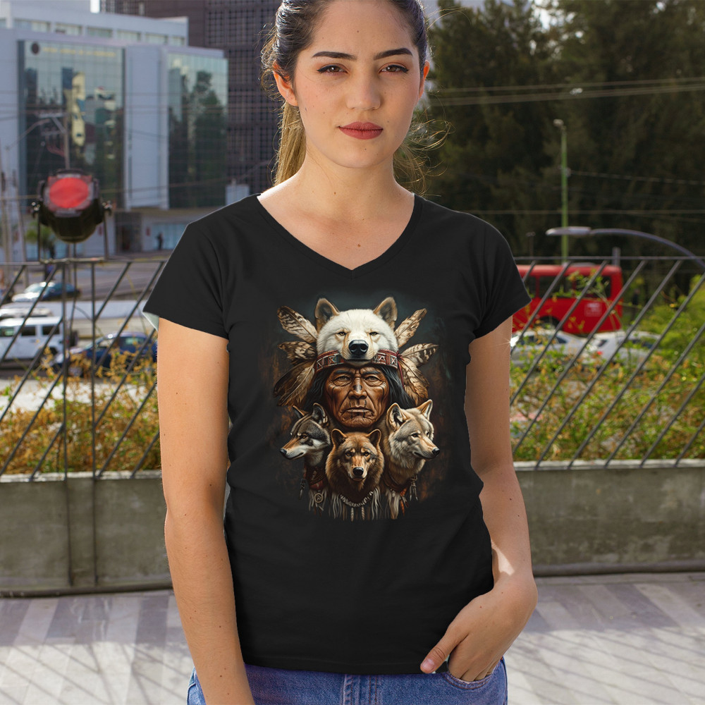Wolf totem design with Native elder in headdress and guardian wolves. Symbolizes strength, loyalty, spirit animals, and tribal heritage.