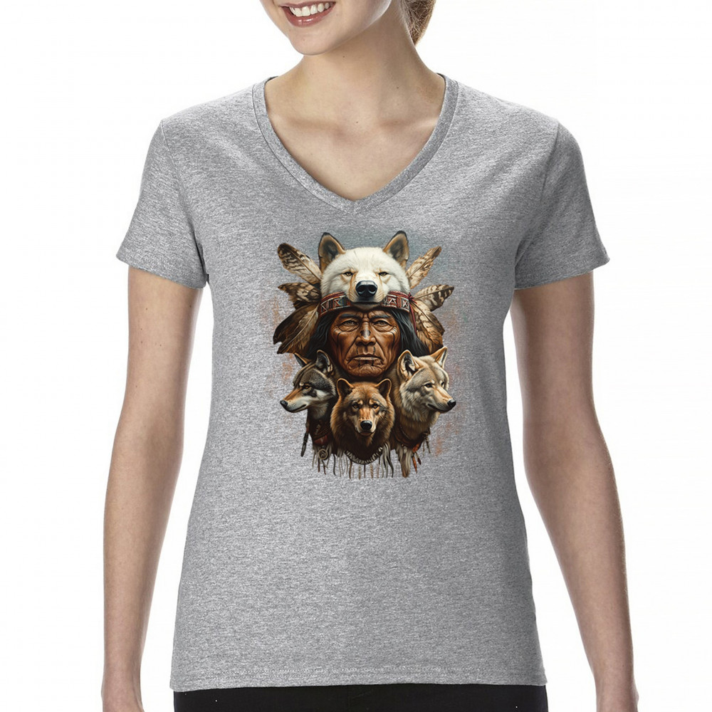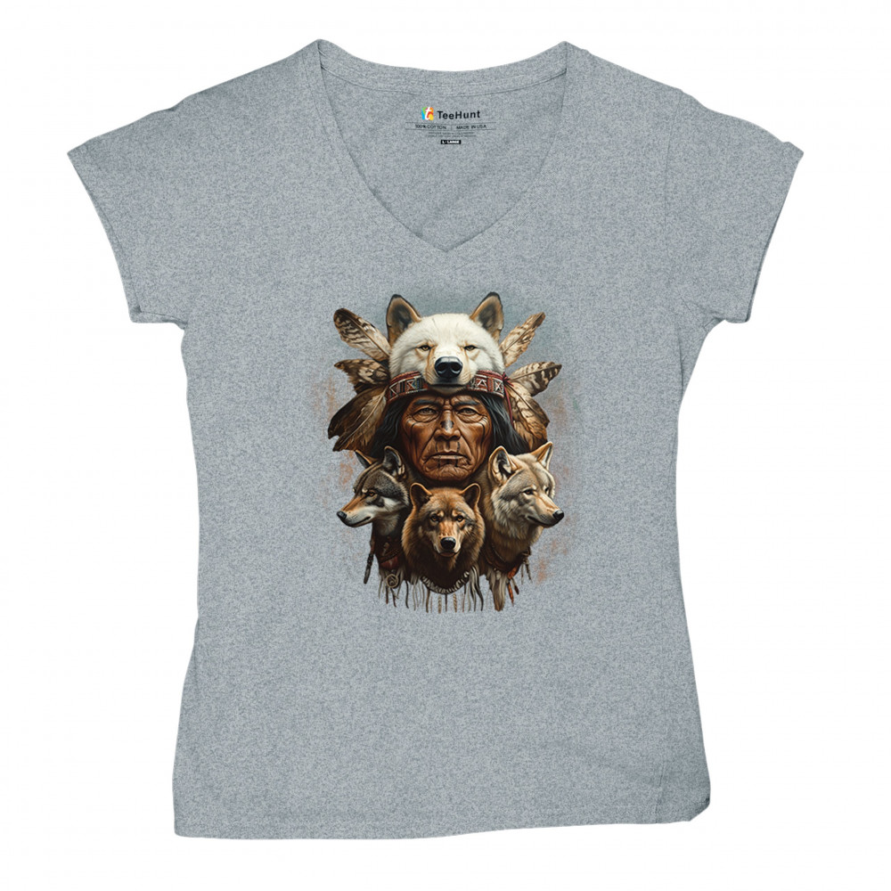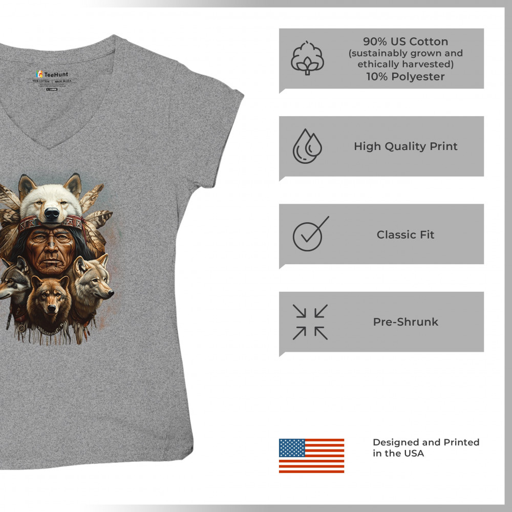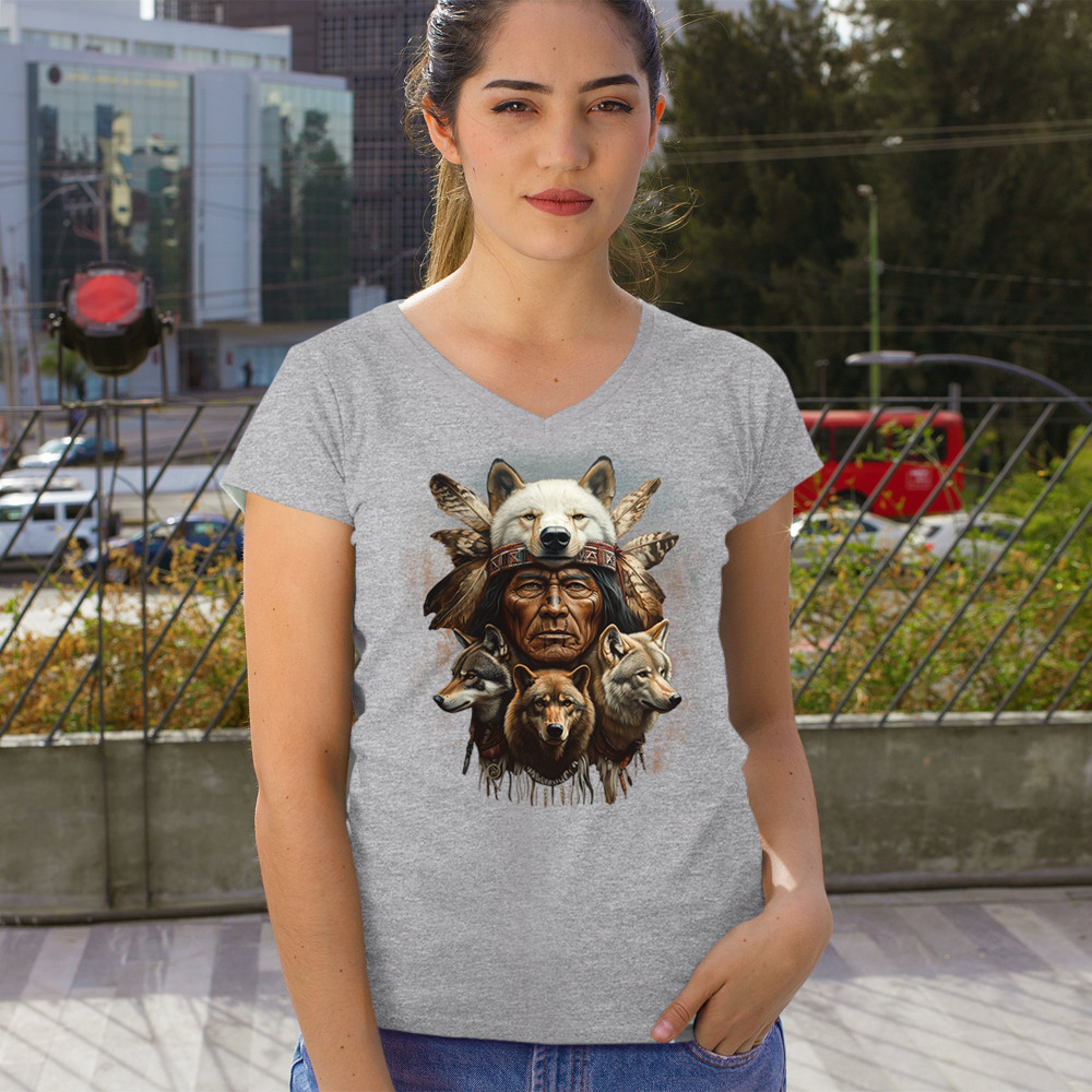 Wolf totem design with Native elder in headdress and guardian wolves. Symbolizes strength, loyalty, spirit animals, and tribal heritage.