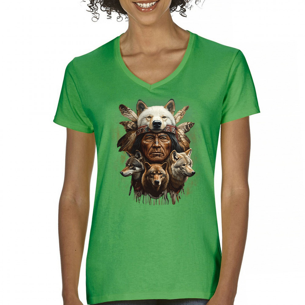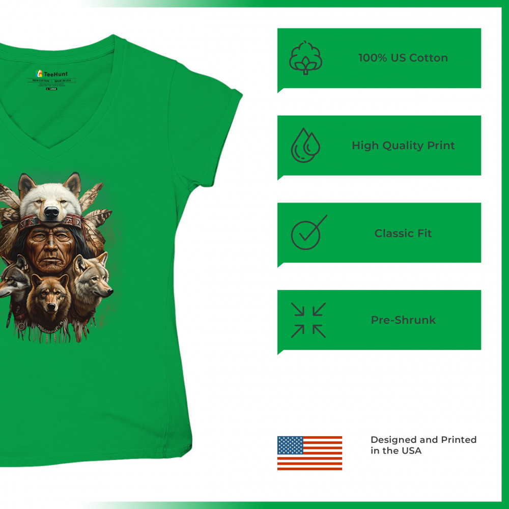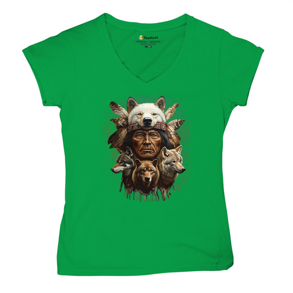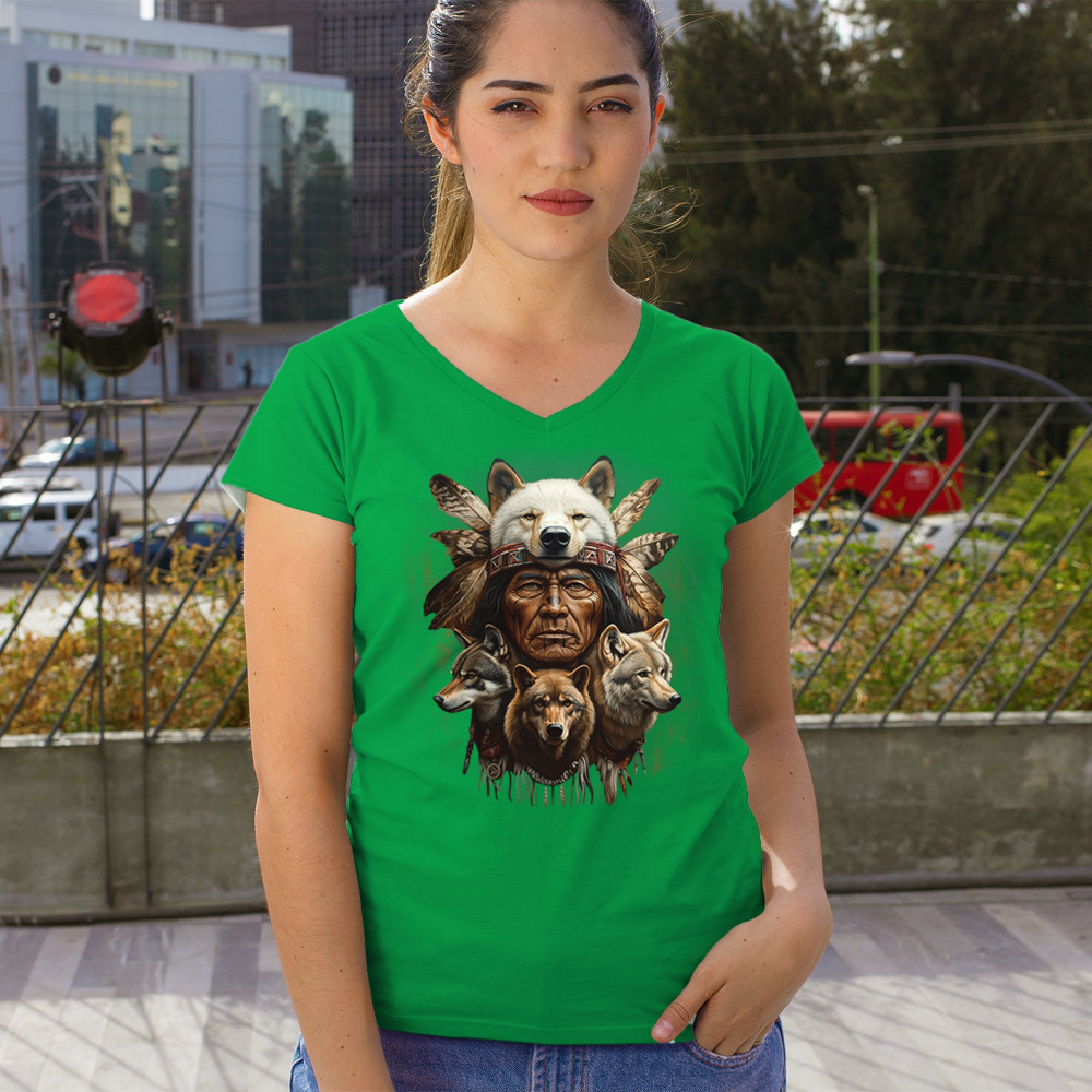 Wolf totem design with Native elder in headdress and guardian wolves. Symbolizes strength, loyalty, spirit animals, and tribal heritage.