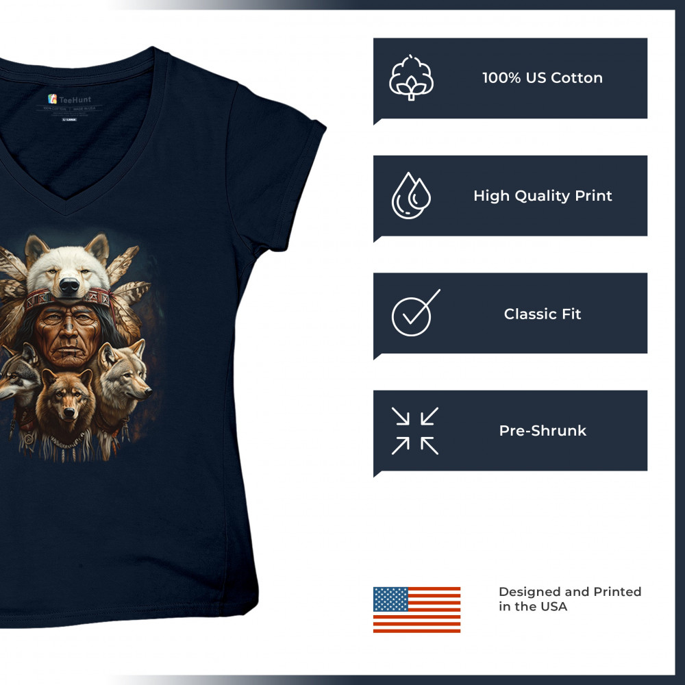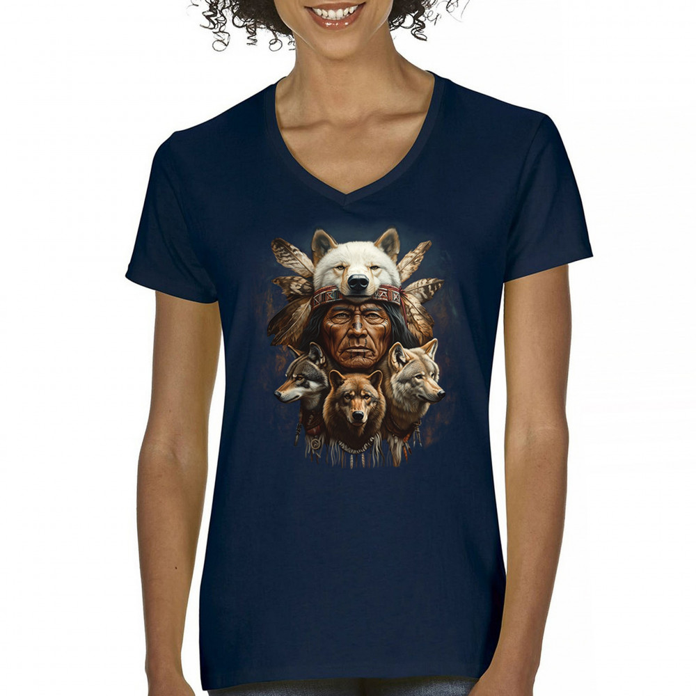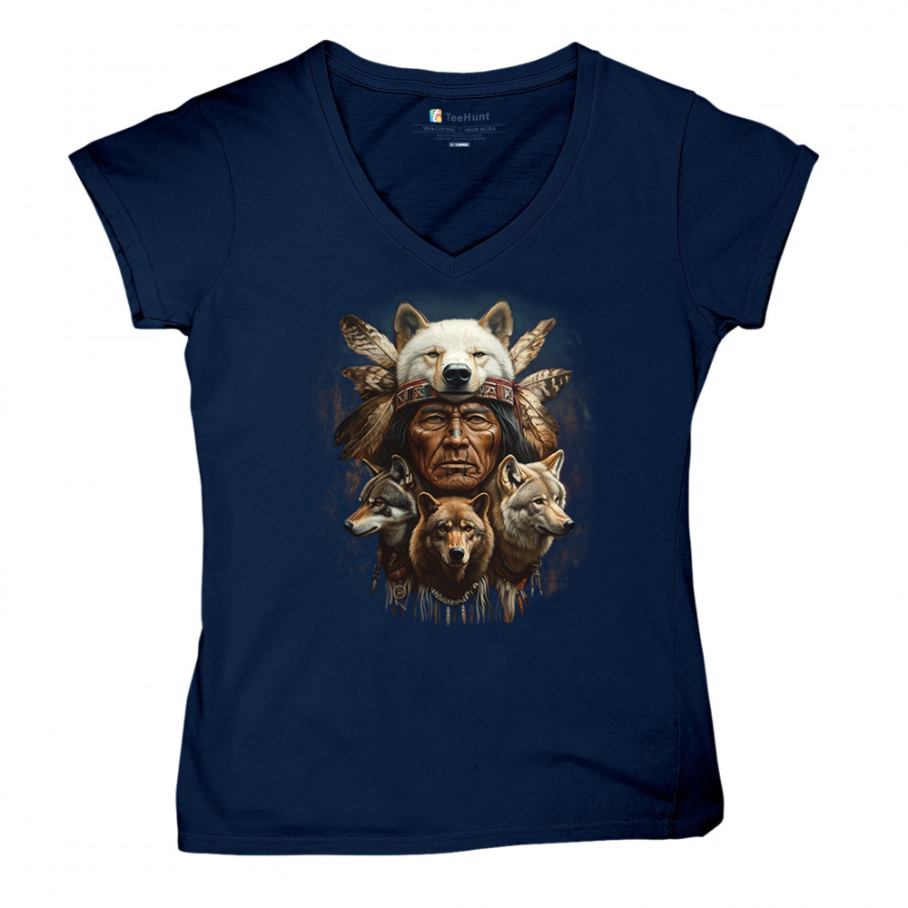 Wolf totem design with Native elder in headdress and guardian wolves. Symbolizes strength, loyalty, spirit animals, and tribal heritage.