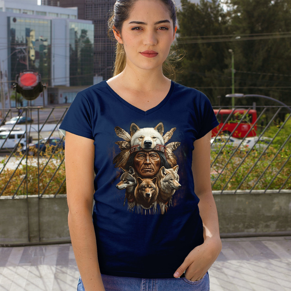 This spiritual tribal design showcases a Native American elder in a detailed wolf headdress surrounded by guardian wolves. It represents strength, loyalty, instinct, and sacred unity with nature. A powerful totem for honoring animal bonds, native pride, and ancestral spiritual guidance through the spirit of the wolf.