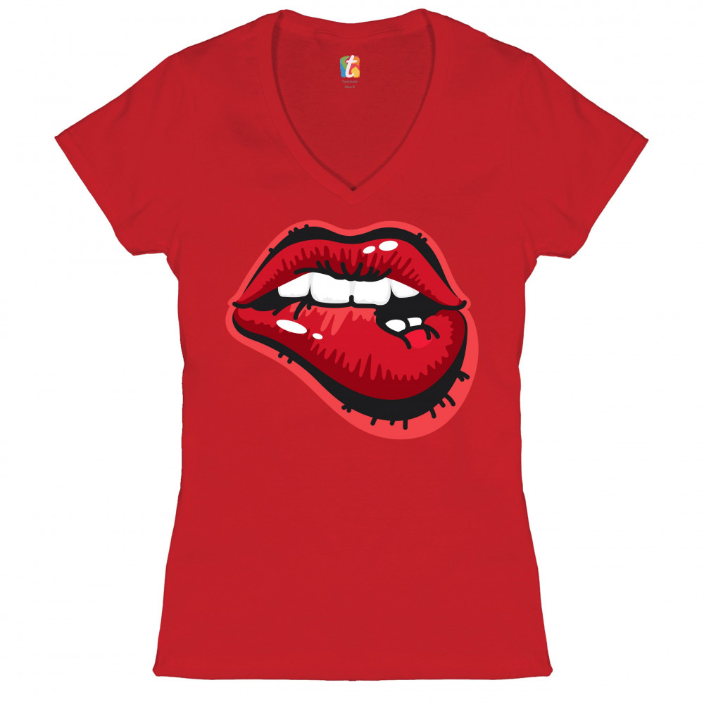 NAUGHTY BITING LIPS women's v-neck t-shirt hot luscious sexy red lips tee red