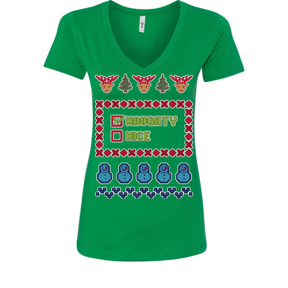 NAUGHTY OR NICE ugly sweater women's v-neck t-shirt christmas xmas holiday list green