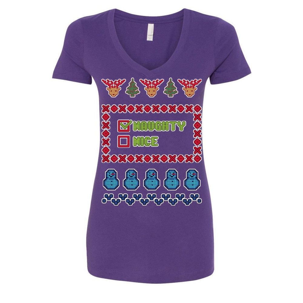 NAUGHTY OR NICE ugly sweater women's v-neck t-shirt christmas xmas holiday list purple