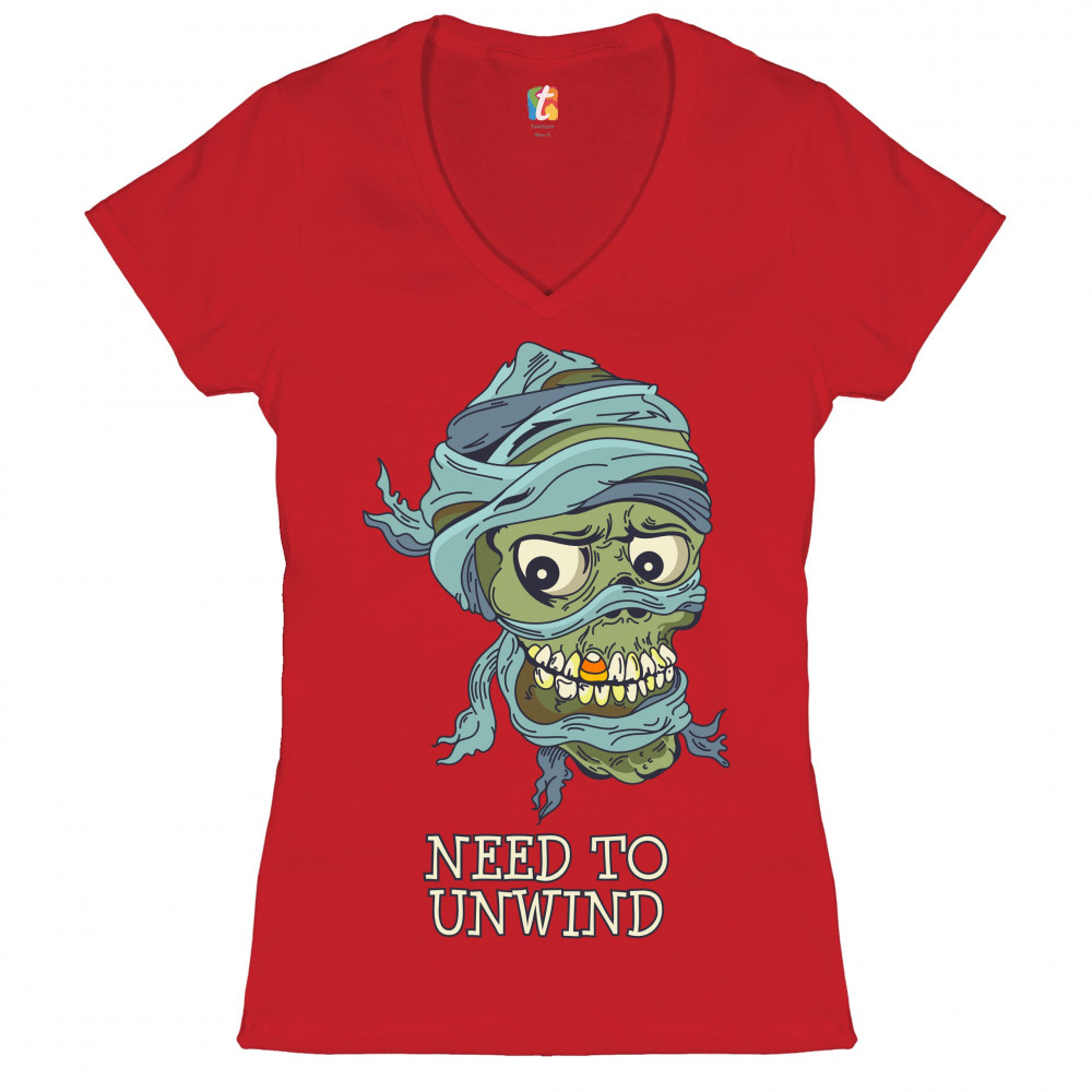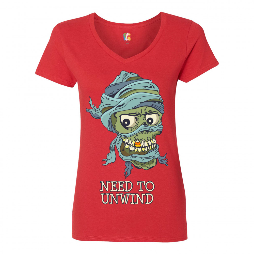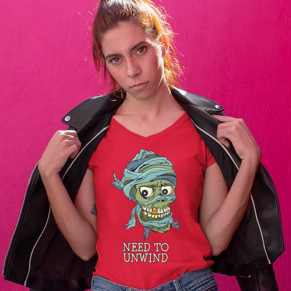 NEED TO UNWIND women's v-neck t-shirt halloween zombie trick-or-treat tee red