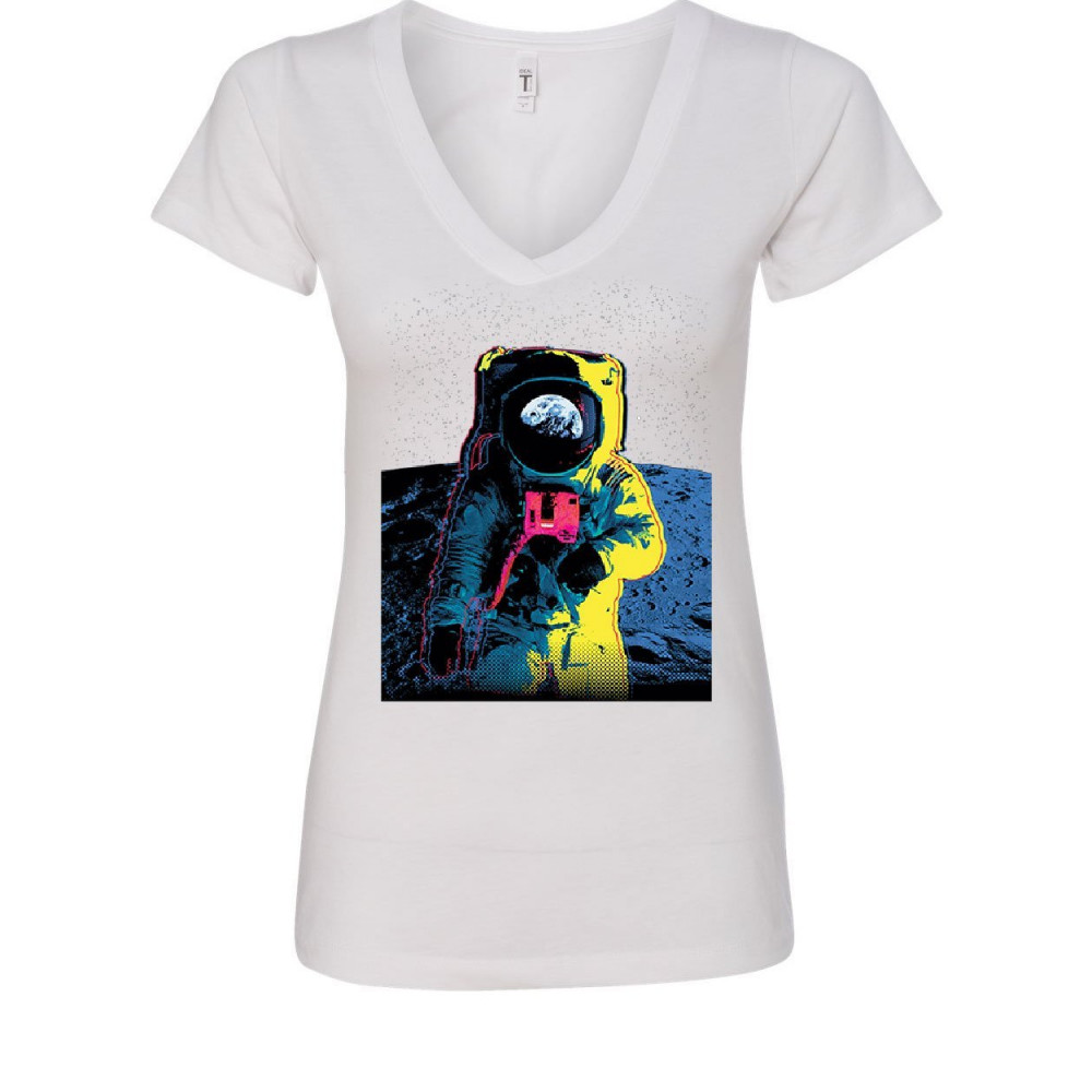 NEON ASTRONAUT women's v-neck t-shirt moon landing space travel universe earth white