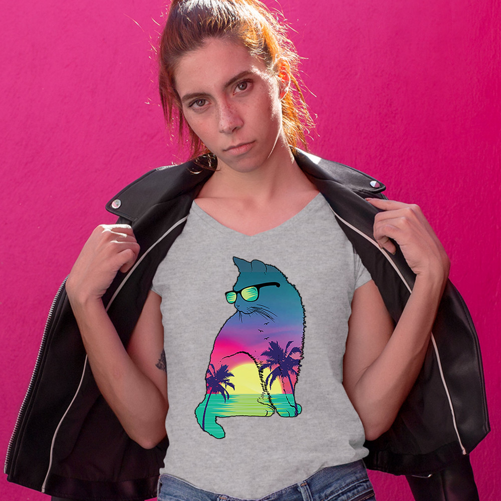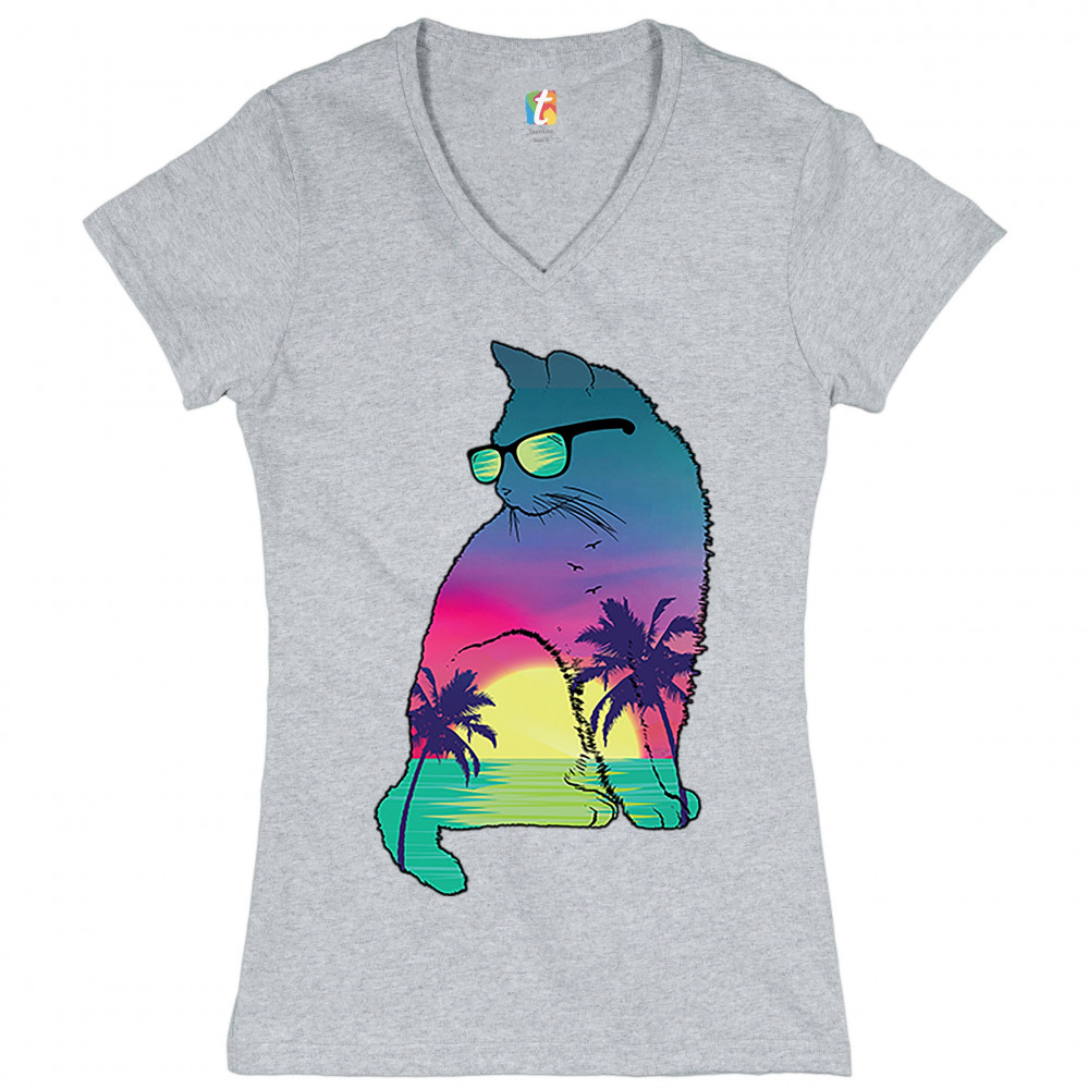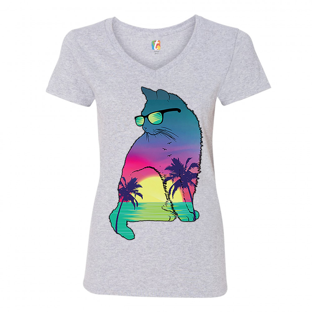NEON CAT IN SUNGLASSES women's v-neck t-shirt tropic kitten summer kitty tee gray