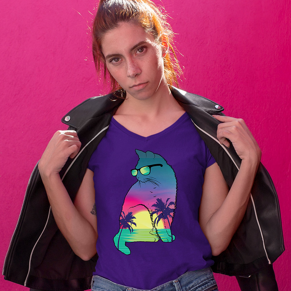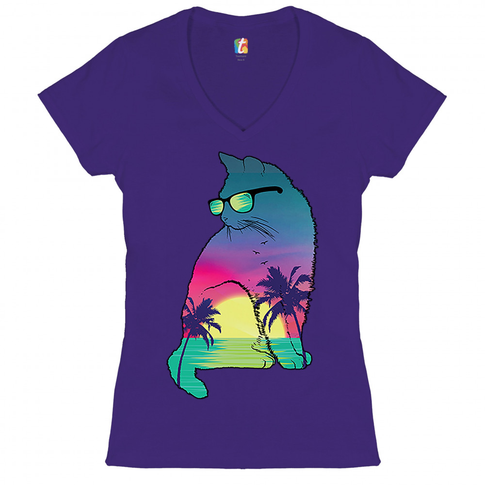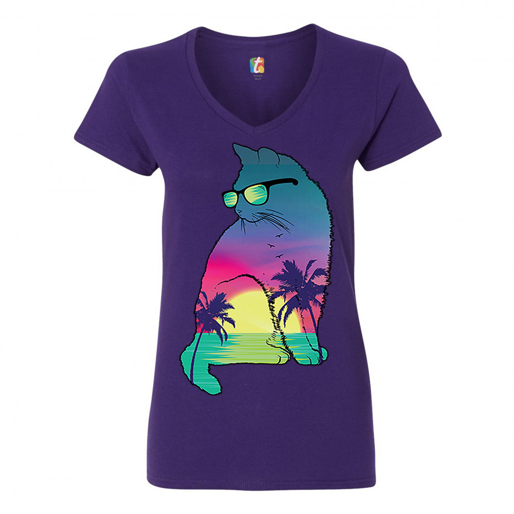 NEON CAT IN SUNGLASSES women's v-neck t-shirt tropic kitten summer kitty tee purple