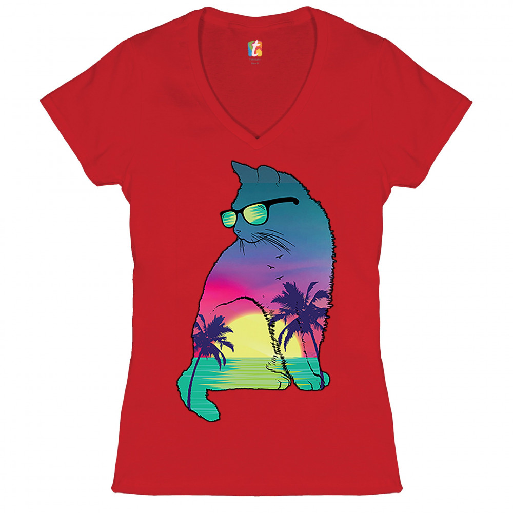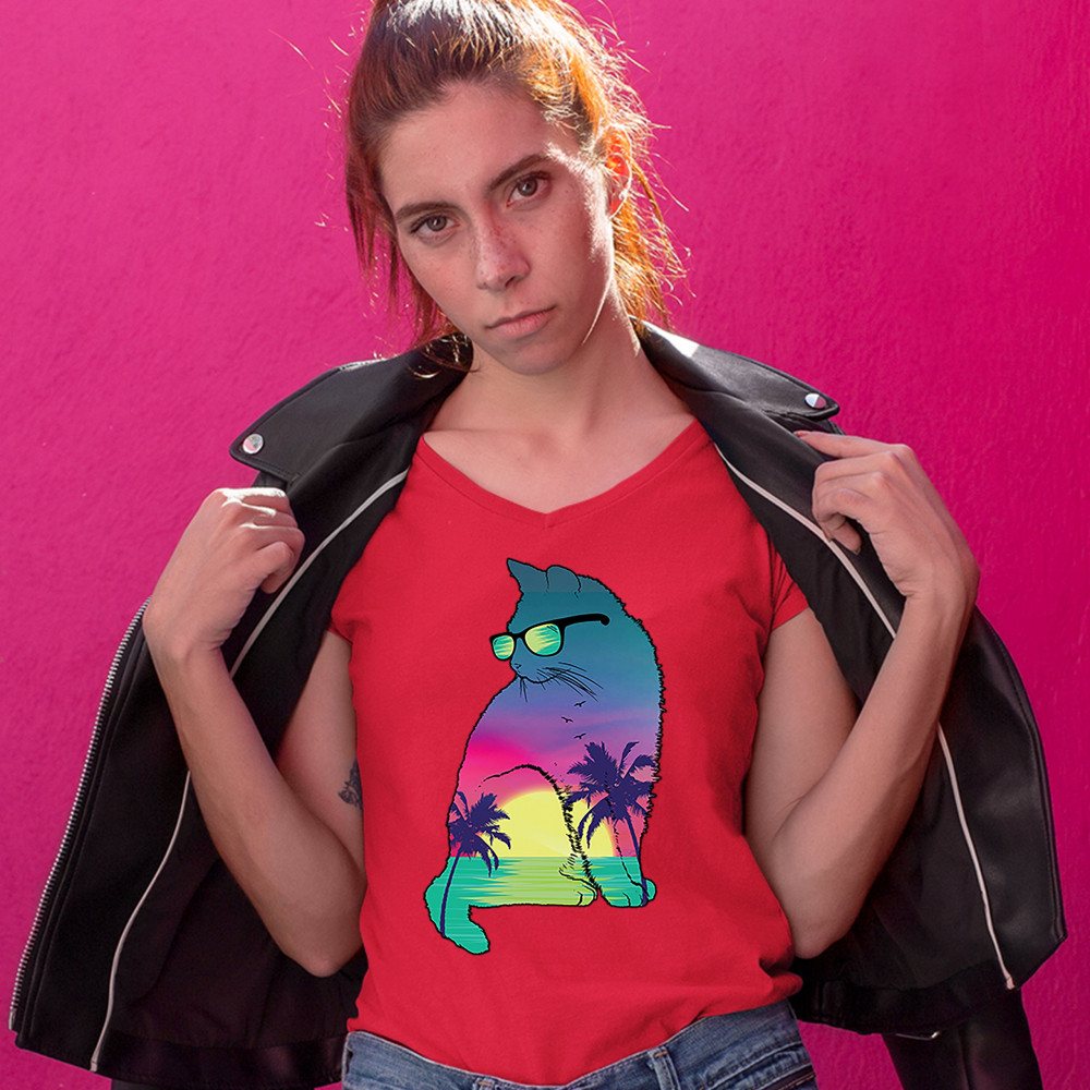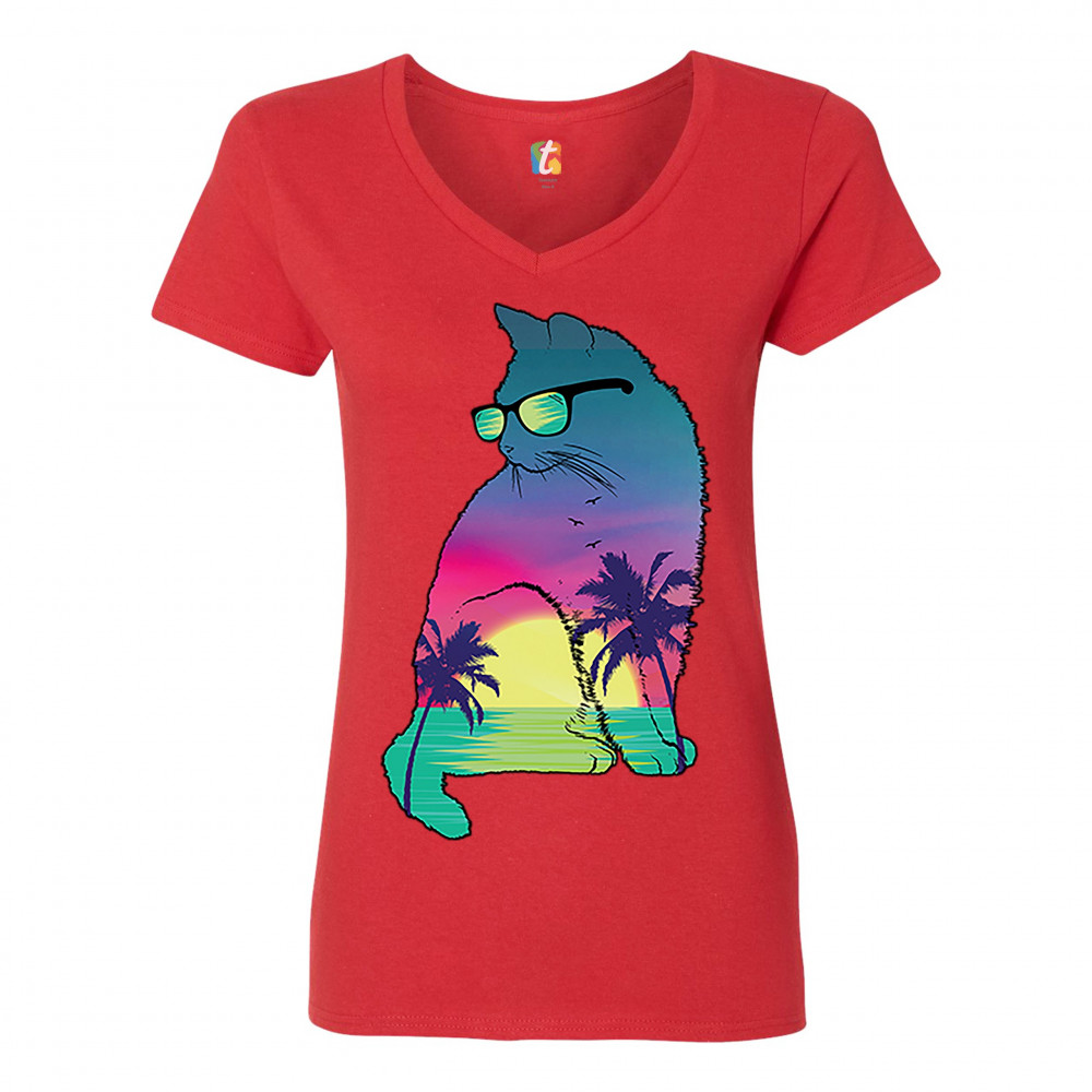 NEON CAT IN SUNGLASSES women's v-neck t-shirt tropic kitten summer kitty tee red