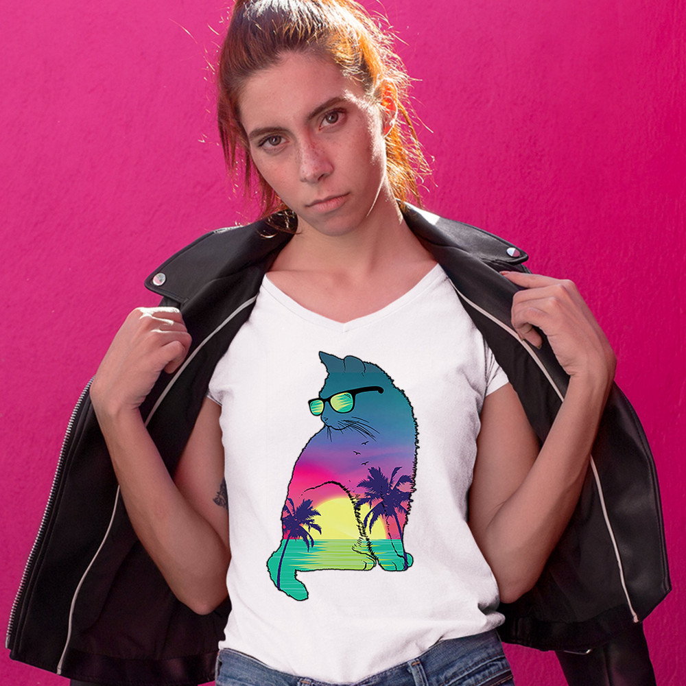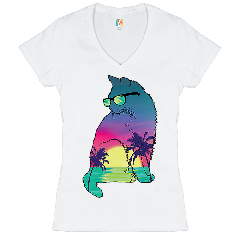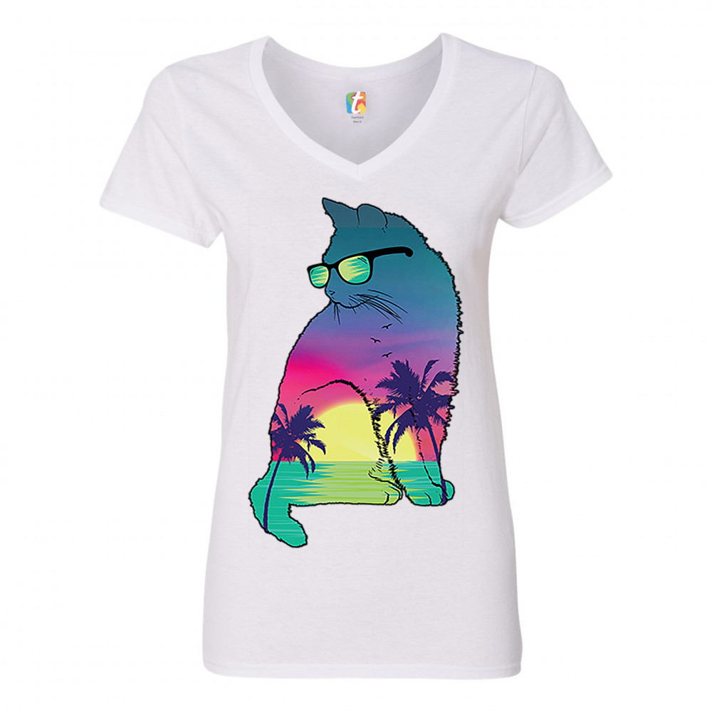 NEON CAT IN SUNGLASSES women's v-neck t-shirt tropic kitten summer kitty tee white