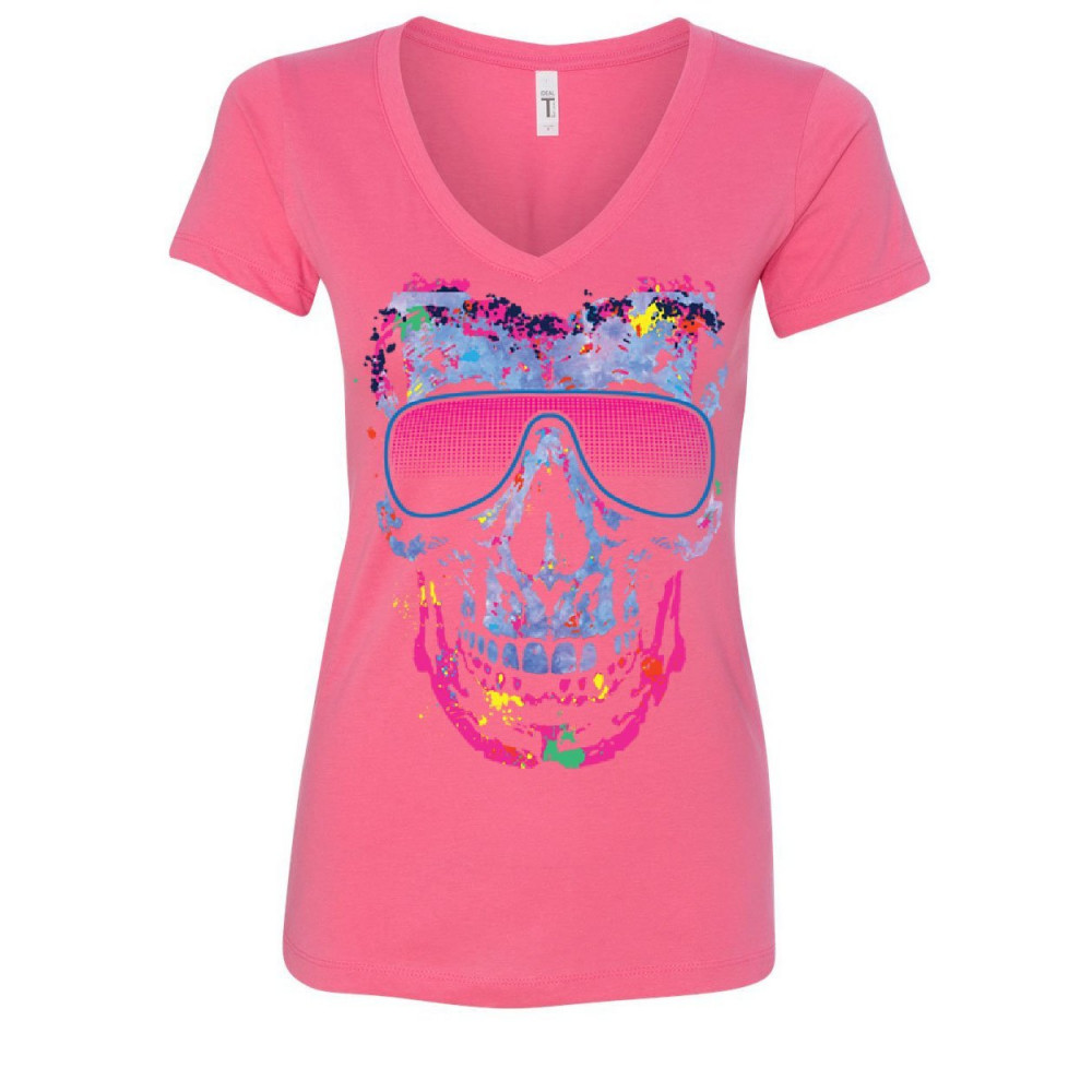 NEON SKULL SUNGLASSES women's v-neck t-shirt swag multicolor music edm rave pop pink