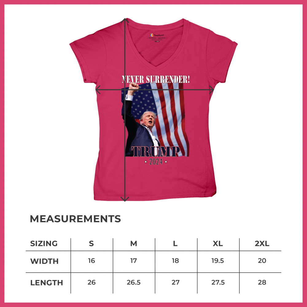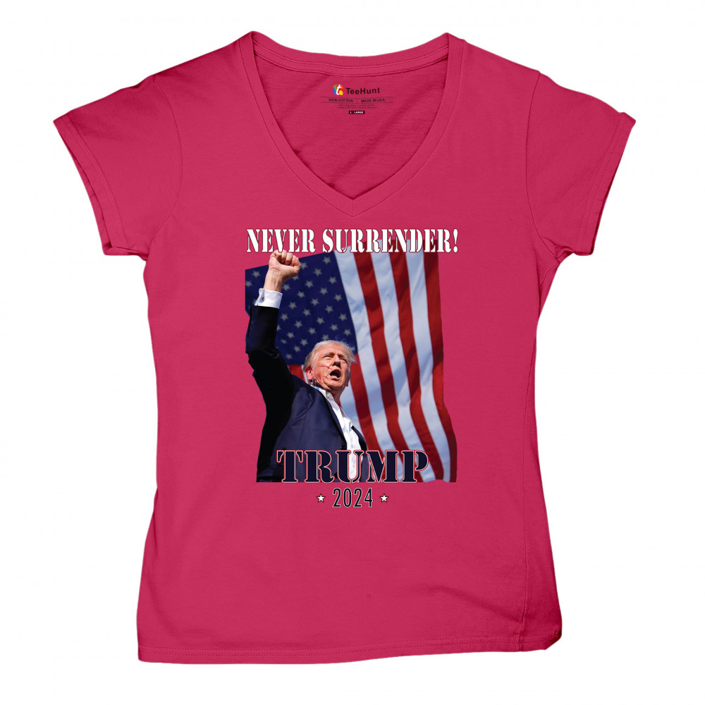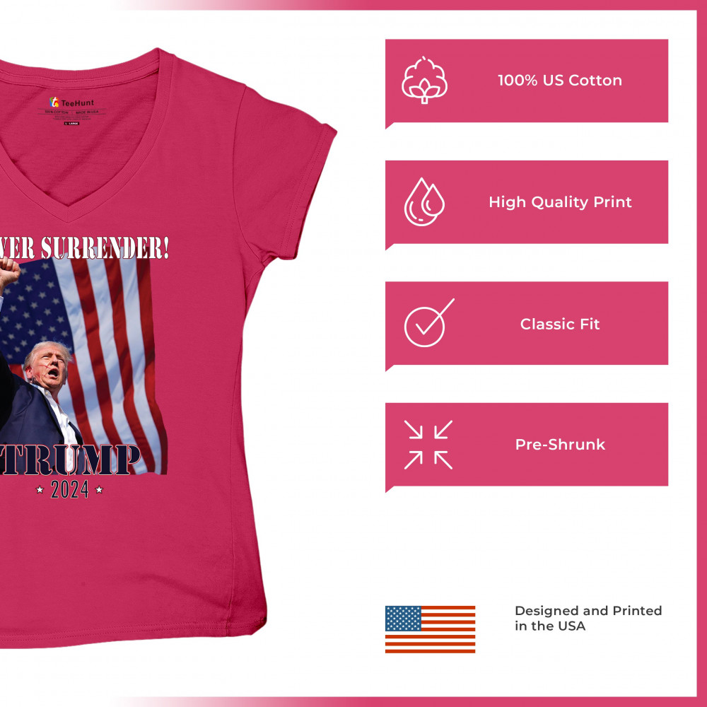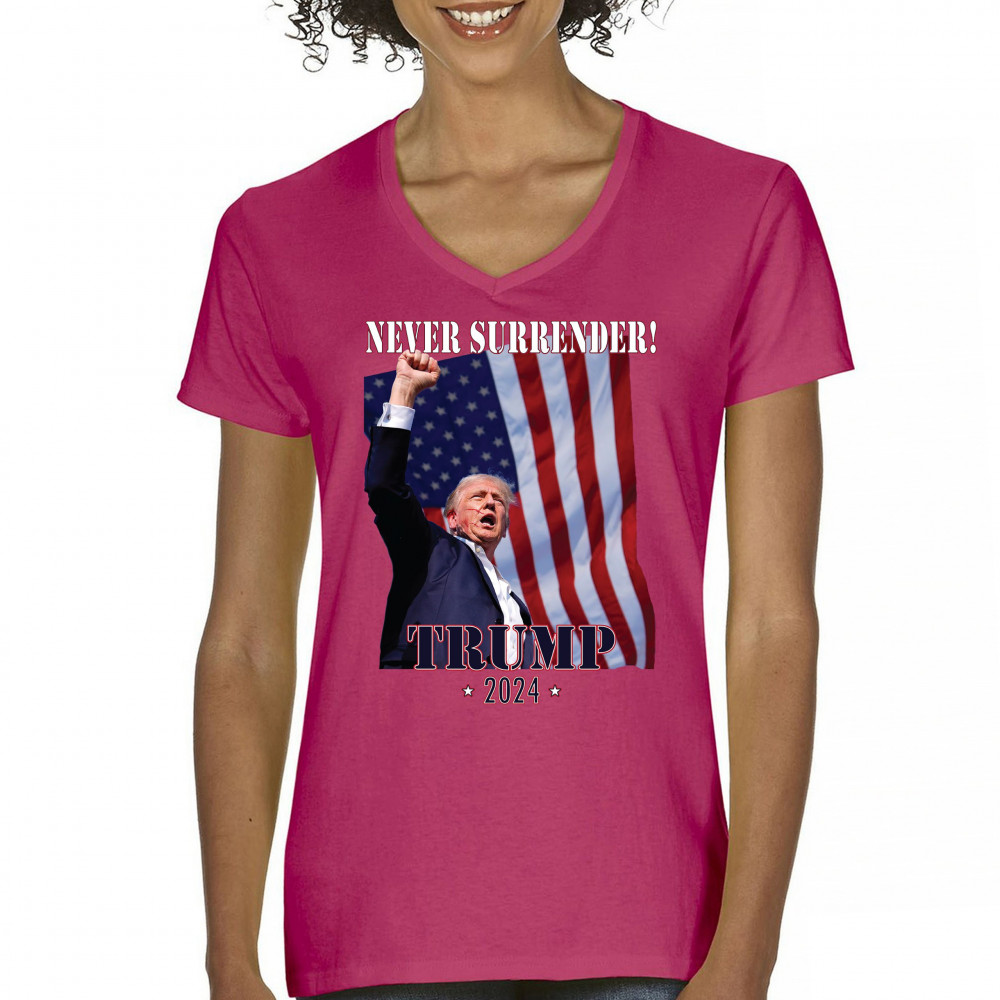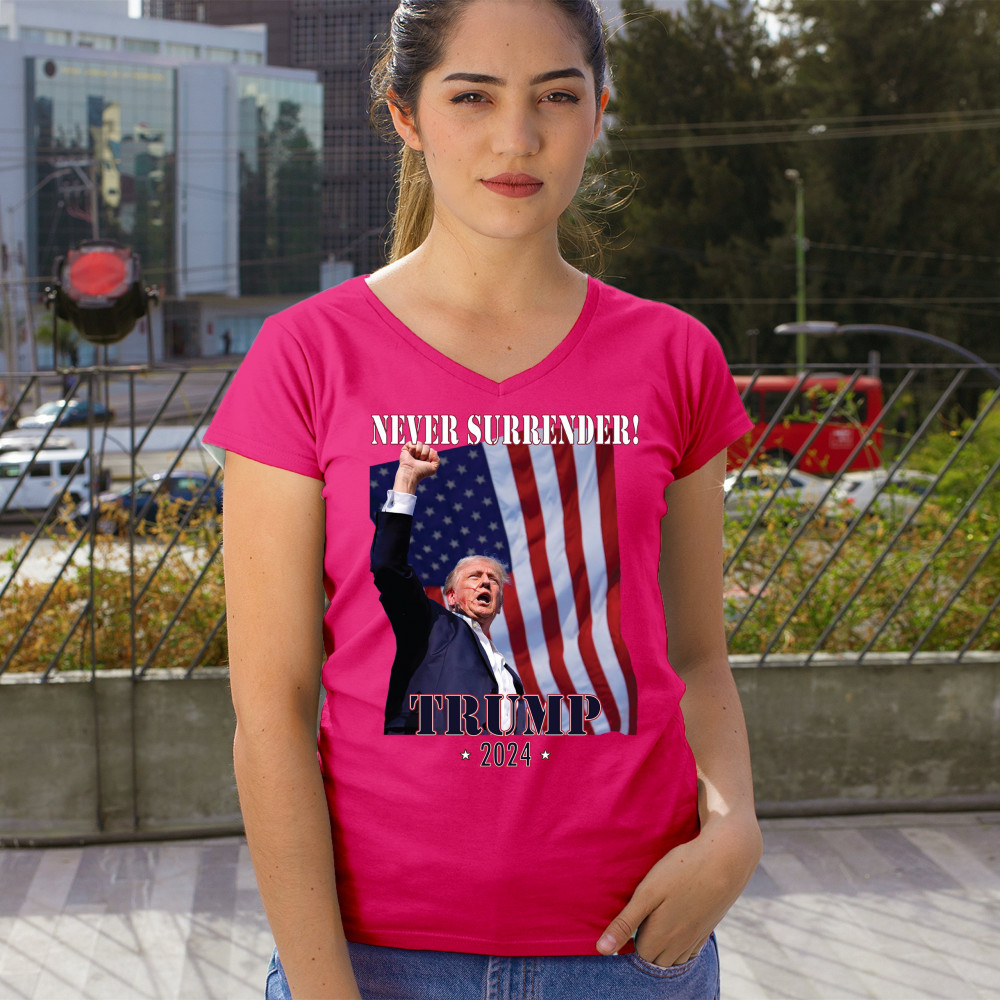 Support Donald Trump with our bold "Never Surrender! Trump 2024" design, featuring Trump against the American flag. Perfect for rallies and everyday wear.
