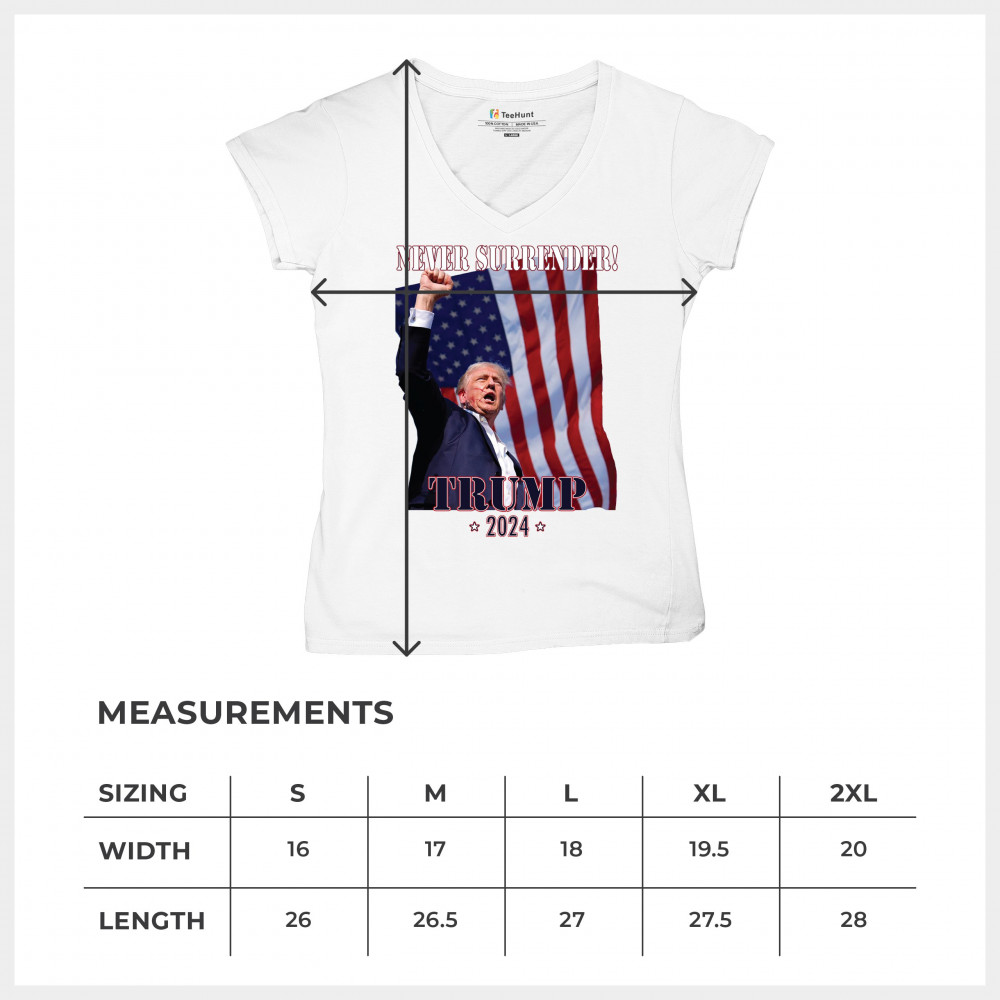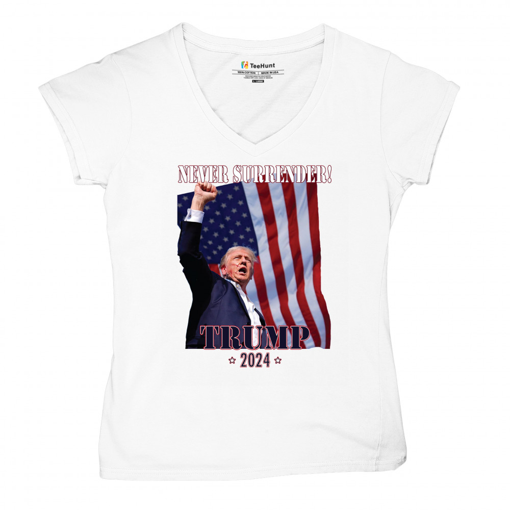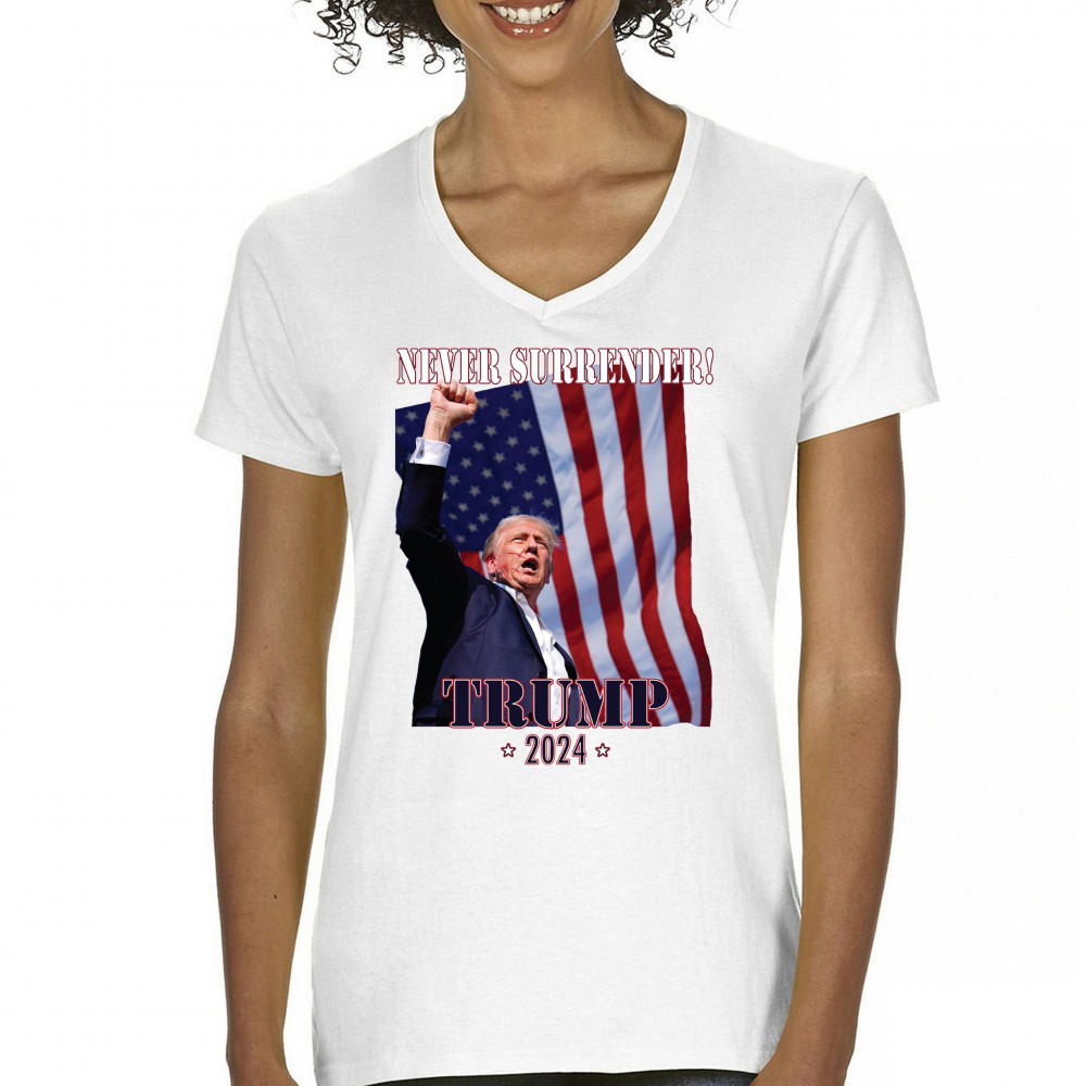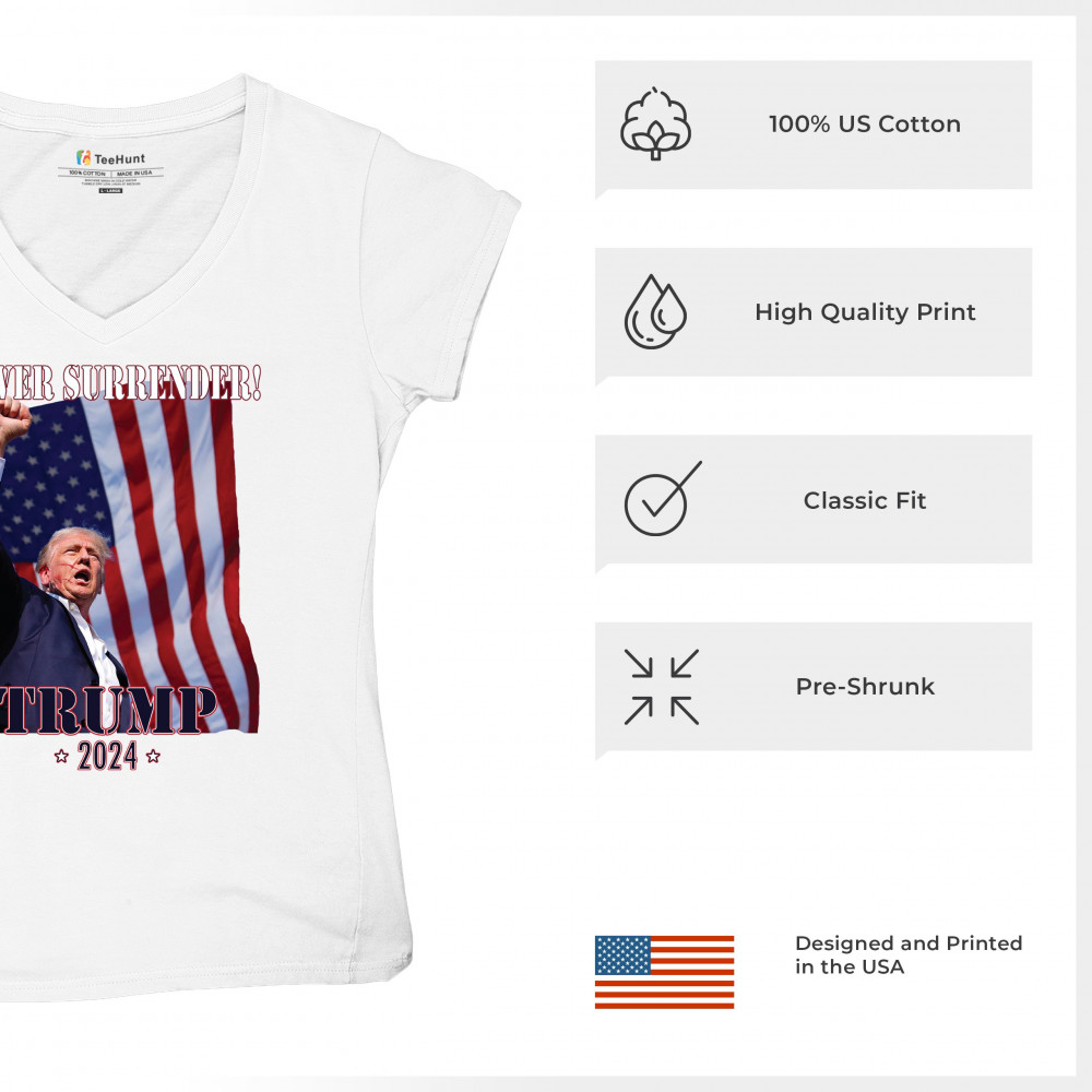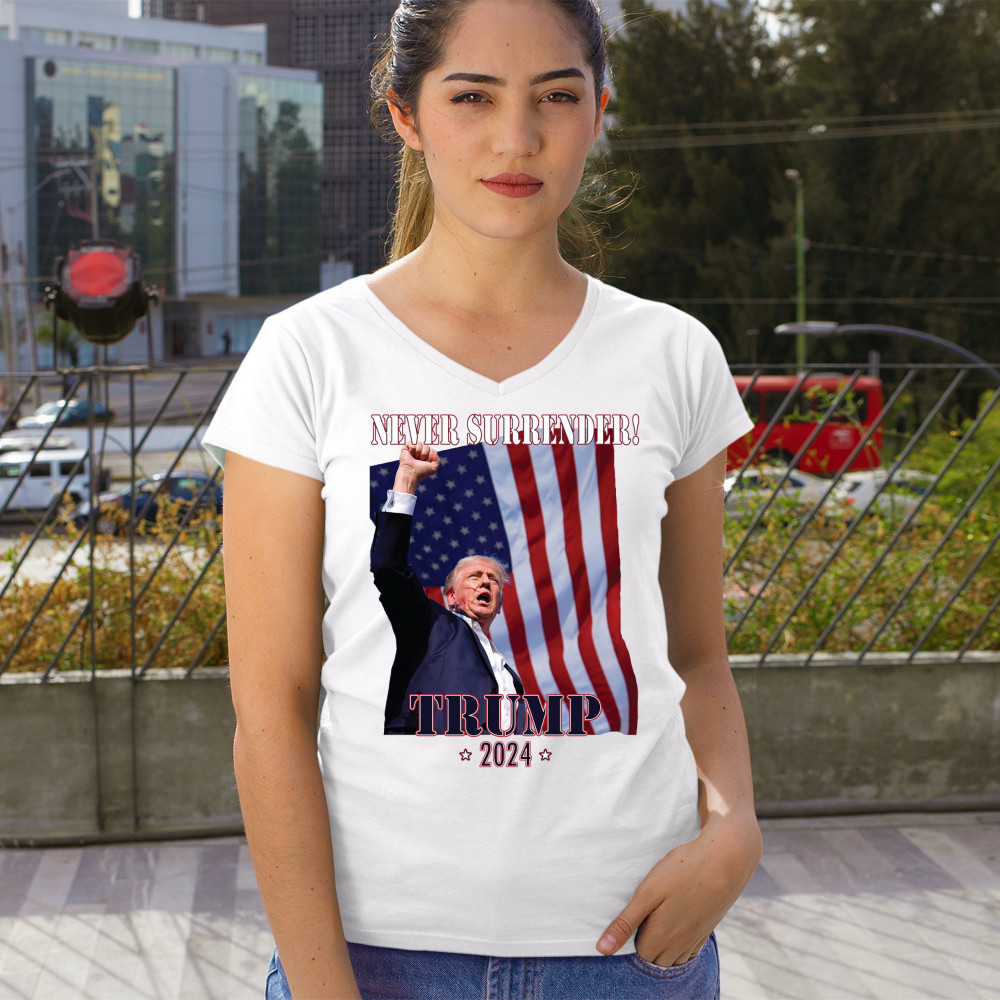 Support Donald Trump with our bold "Never Surrender! Trump 2024" design, featuring Trump against the American flag. Perfect for rallies and everyday wear.