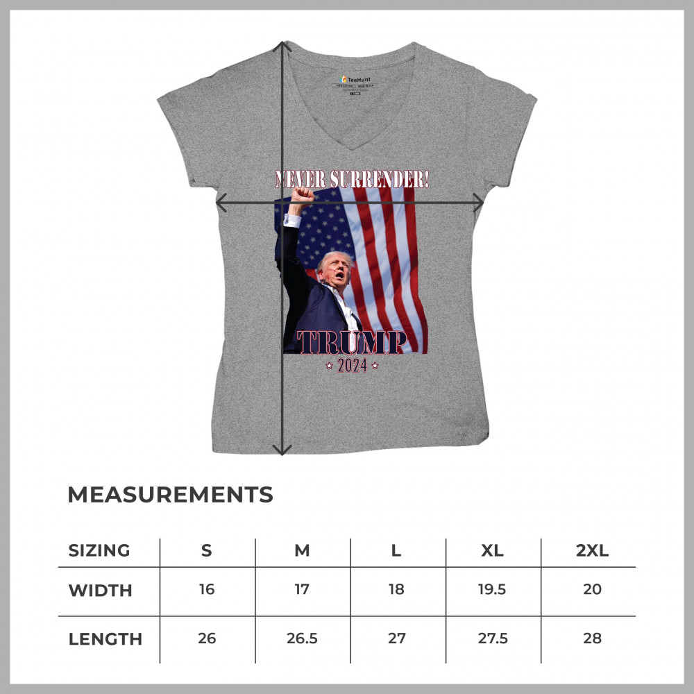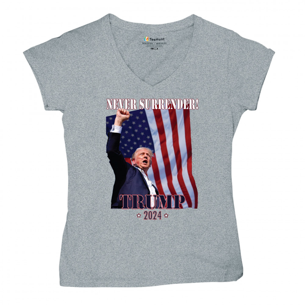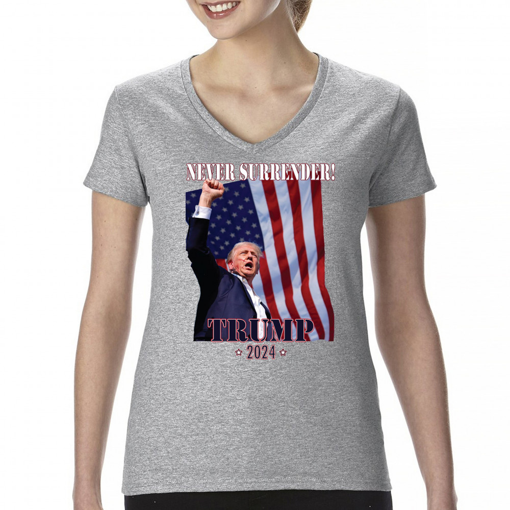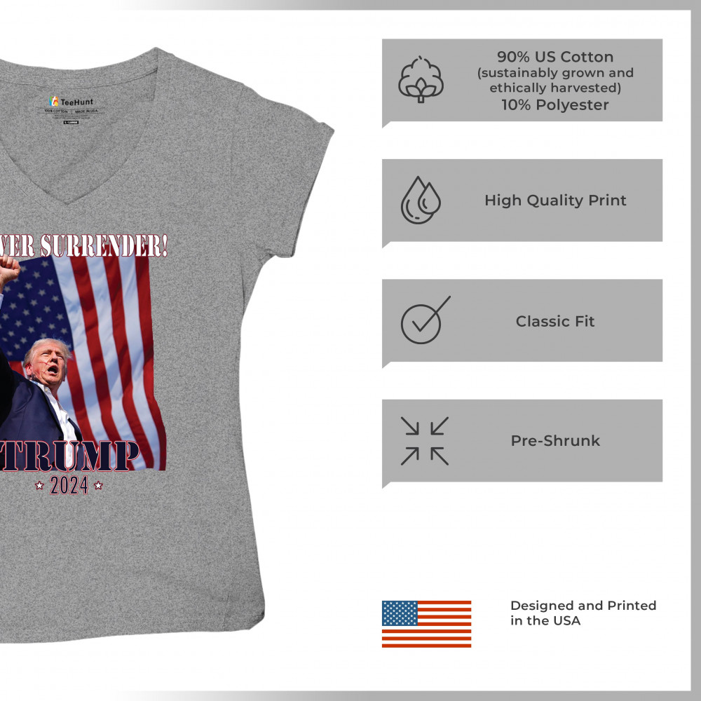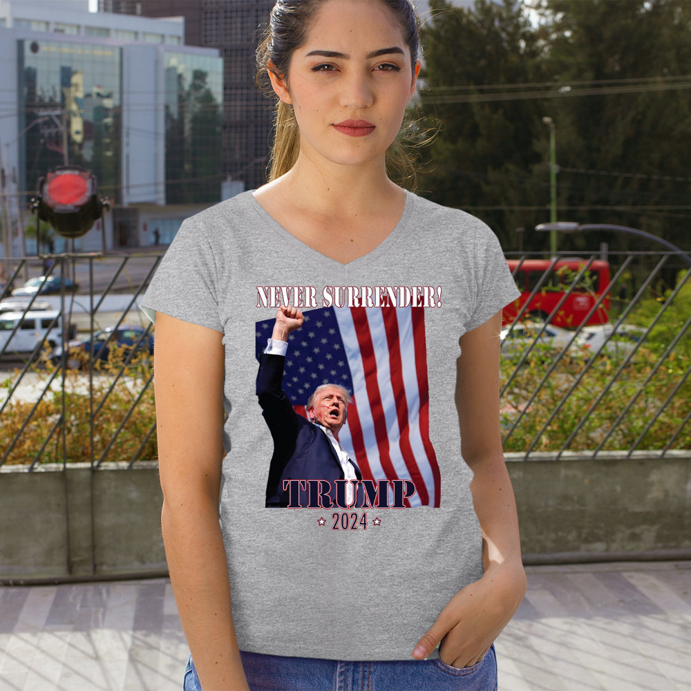 Support Donald Trump with our bold "Never Surrender! Trump 2024" design, featuring Trump against the American flag. Perfect for rallies and everyday wear.