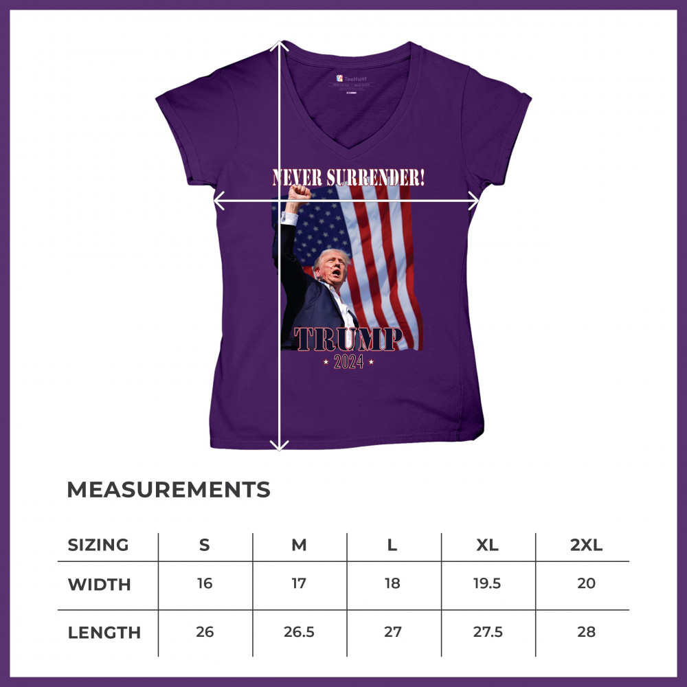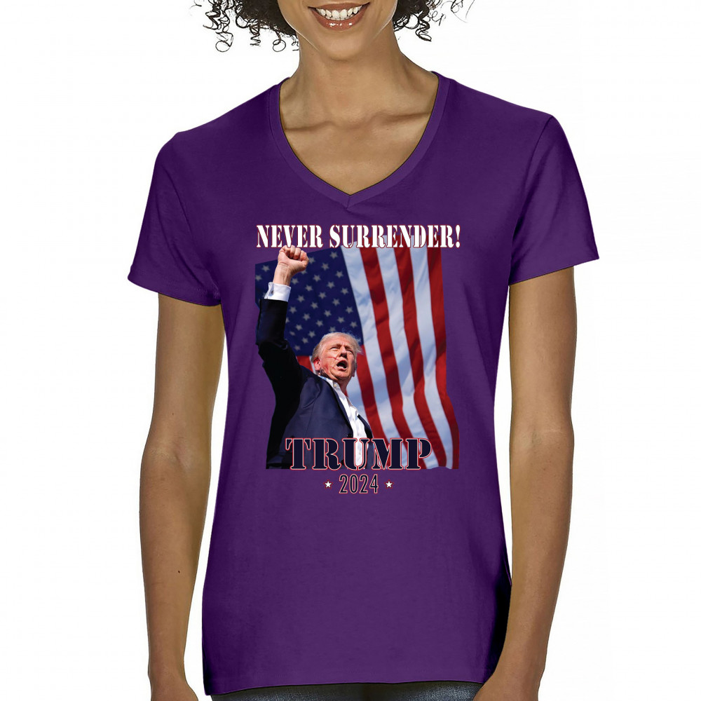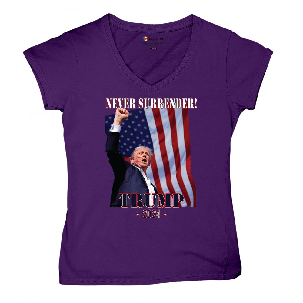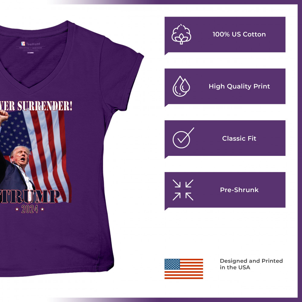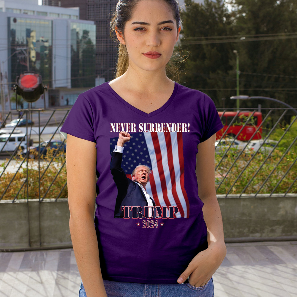 Support Donald Trump with our bold "Never Surrender! Trump 2024" design, featuring Trump against the American flag. Perfect for rallies and everyday wear.