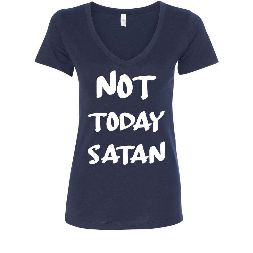 NOT TODAY SATAN women's v-neck tee religious funny jesus religion navy blue